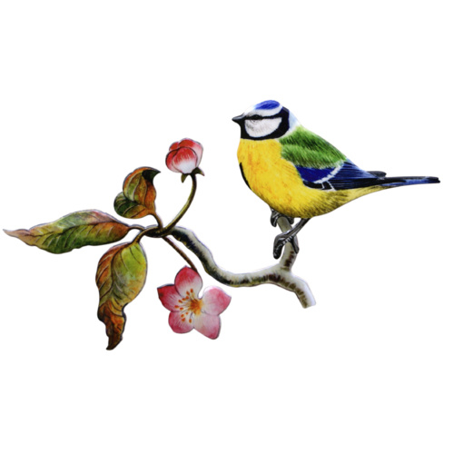 Sculpture en métal d’intérieur fabriquée en Poitou-Charentes de façon artisanale, représentant une jolie mésange bleue posée sur une branche. Réalisée à partir de dessins originaux de Cyril GIRARD, aquarelliste ornithologue et de Sylvia Trouvé, artiste peintre. La tôle après avoir été emboutie est peinte, et le décor après impression est retouché à la main. Le vernis de finition, comme glaçure, vient assurer la protection et la brillance.