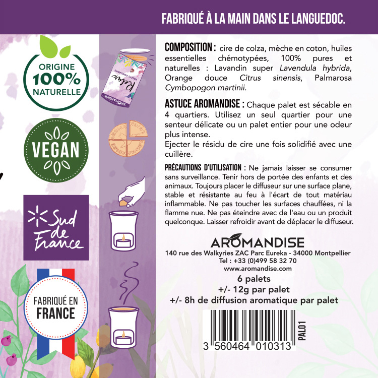 Chaque palet est sécable en 4 quartiers. Utilisez un seul quartier pour une senteur délicate ou un palet entier pour un parfum plus intense.