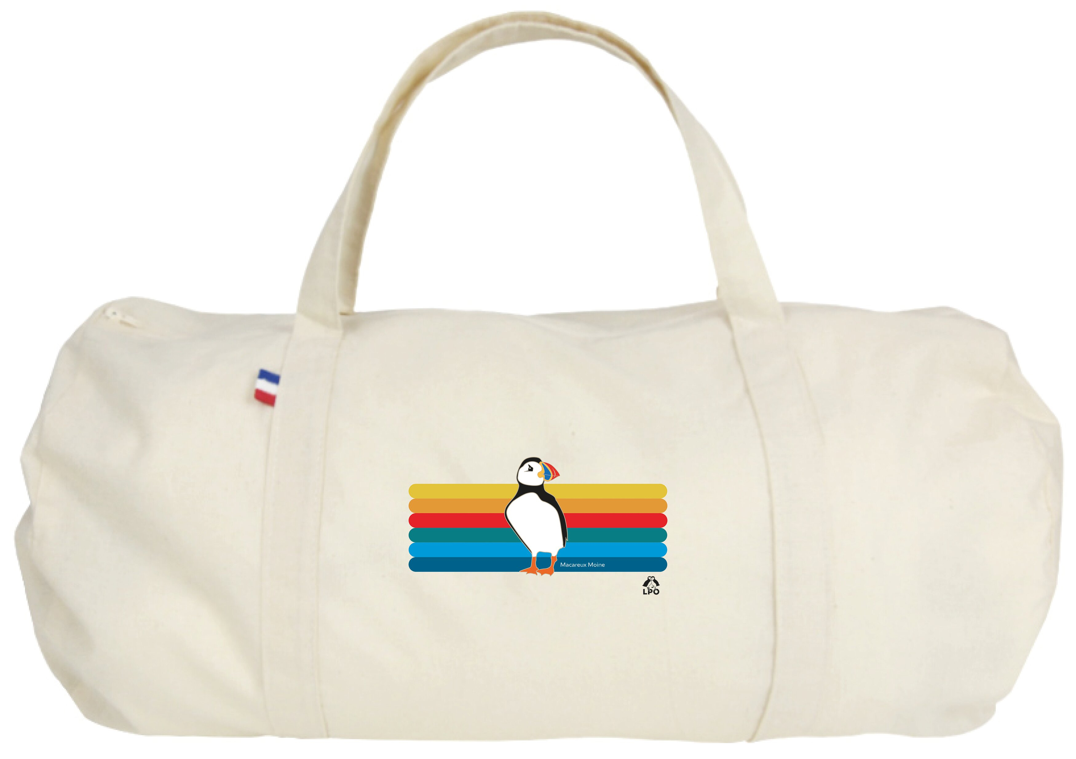 Les amateurs d'oiseaux de mer se réjouiront de ce sac Bowling LPO en coton Bio qui est orné d'un joli Macareux moine, dont les caractéristiques sont proches de la réalité : un bec multicolore, des détails autour des yeux aérographés, des "plumes" duveteuses noires et blanches, de courtes pattes trapues orange vif, des pieds palmés et un corps rond.