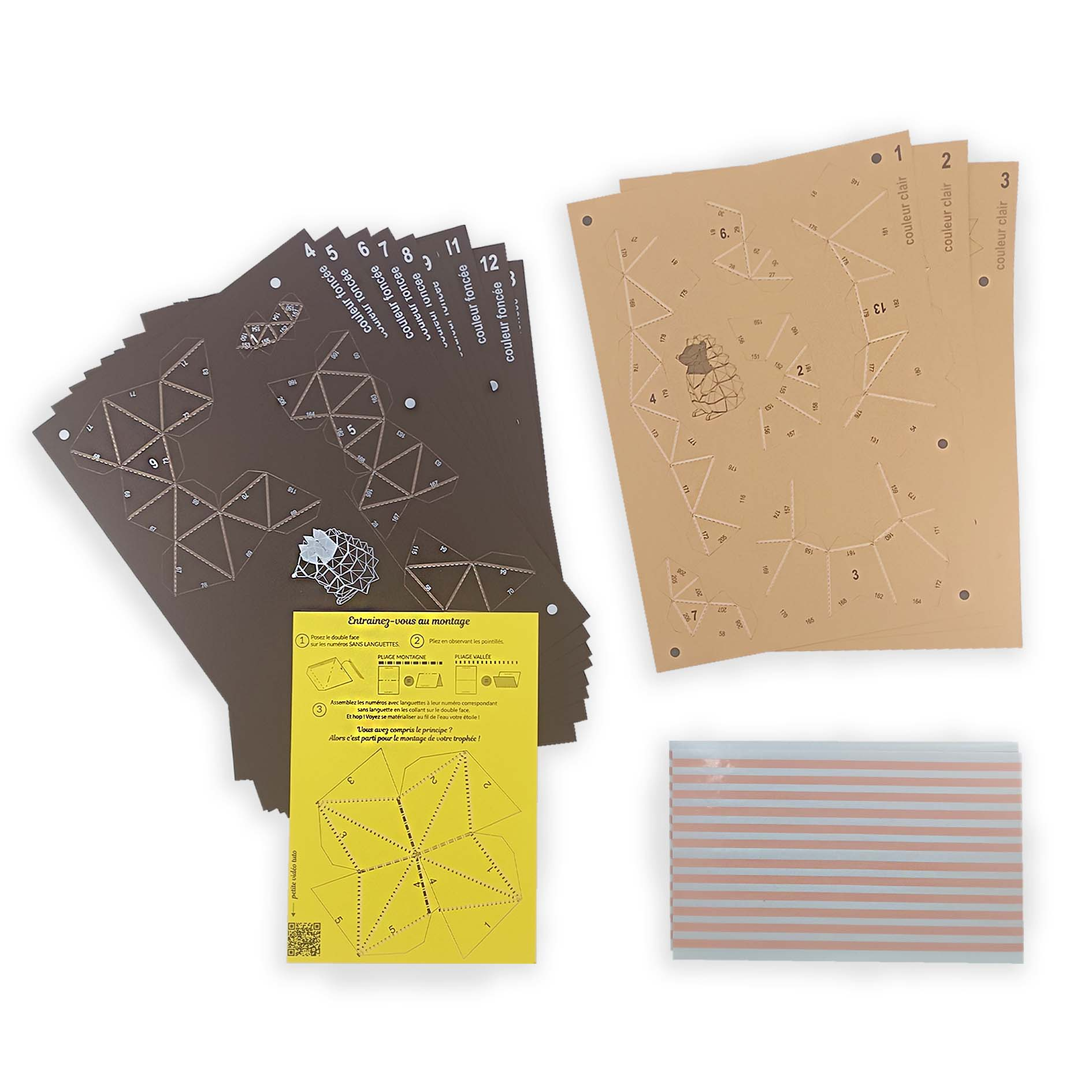 Tout le nécessaire est fourni dans un kit contenant 13 planches de papier et de l'adhésif double face. Des instructions simples, étape par étape, facilitent le processus de montage. Chaque feuille est soigneusement sélectionnée pour assurer une expérience de pliage agréable pour un bel effet de volume. (Temps de montage 2h)