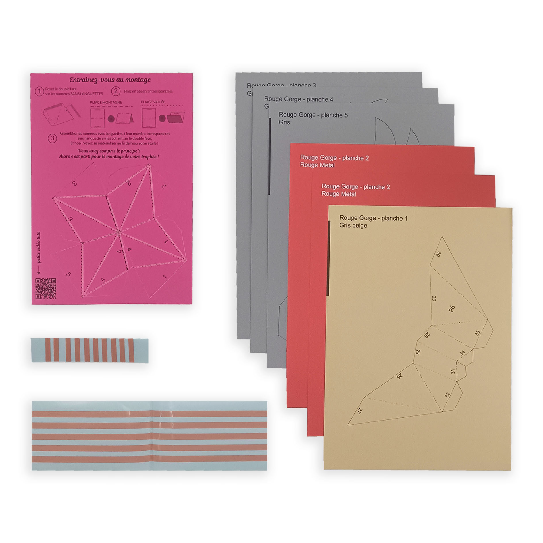 Tout le nécessaire est fourni dans un kit contenant 5 planches de papier et de l'adhésif double face. Des instructions simples, étape par étape, facilitent le processus de montage. Chaque feuille est soigneusement sélectionnée pour assurer une expérience de pliage agréable pour un bel effet de volume. (Temps de montage 1h30)