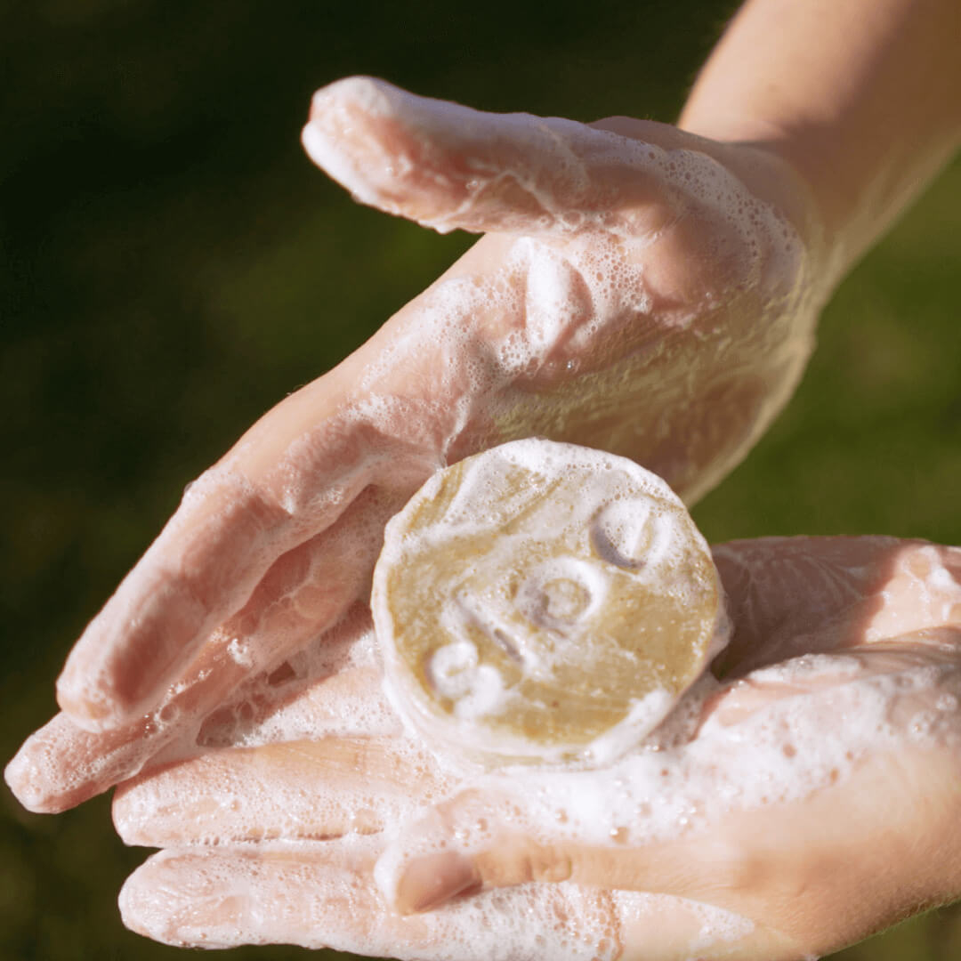 Fais mousser le savon entre vos mains et utilisez le comme savon/gel douche/shampoing.