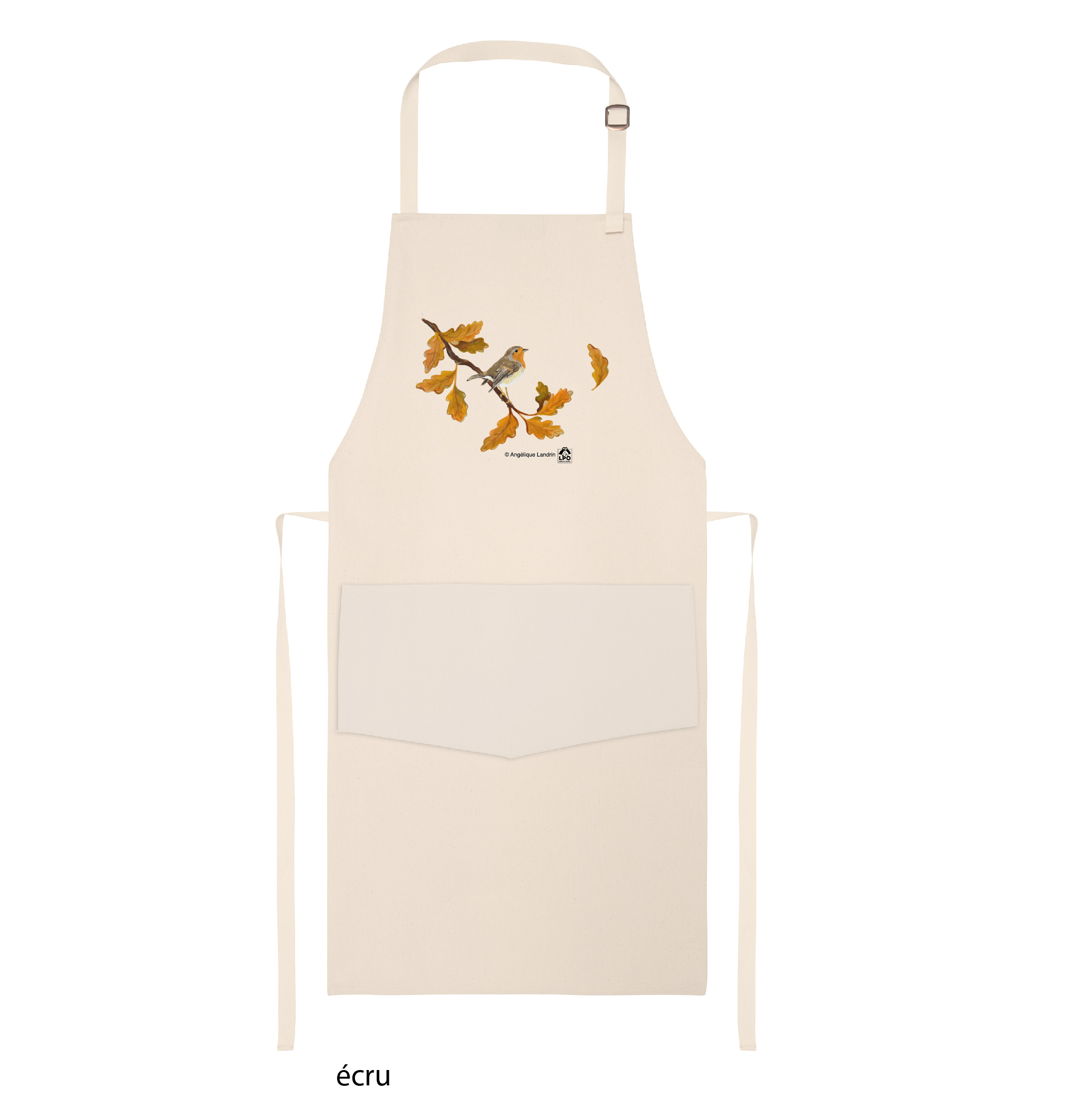 Conçu en 100 % coton bachette de 330 g/m², ce tablier, à la fois pratique et élégant, se distingue par sa texture robuste et son design unique. Doté d'une poche ventrale pratique et d'une boucle de réglage, il offre une grande fonctionnalité. En taille unique et d'un écru intemporel, il est embelli par la délicate illustration de rougegorge sur sa branche en automne, créée par l’artiste Angélique Landrin, qui apporte une touche poétique à cet accessoire de cuisine.
