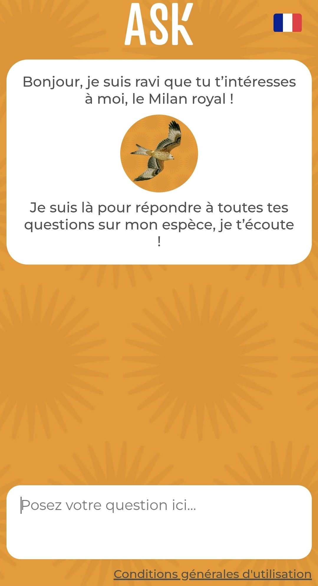Accessible à tous, ce dialogue permet de poser jusqu’à 100 questions pour en apprendre davantage sur le mode de vie du Milan royal, son habitat, les menaces qu'il subit, les actions de protection menées pour le préserver.