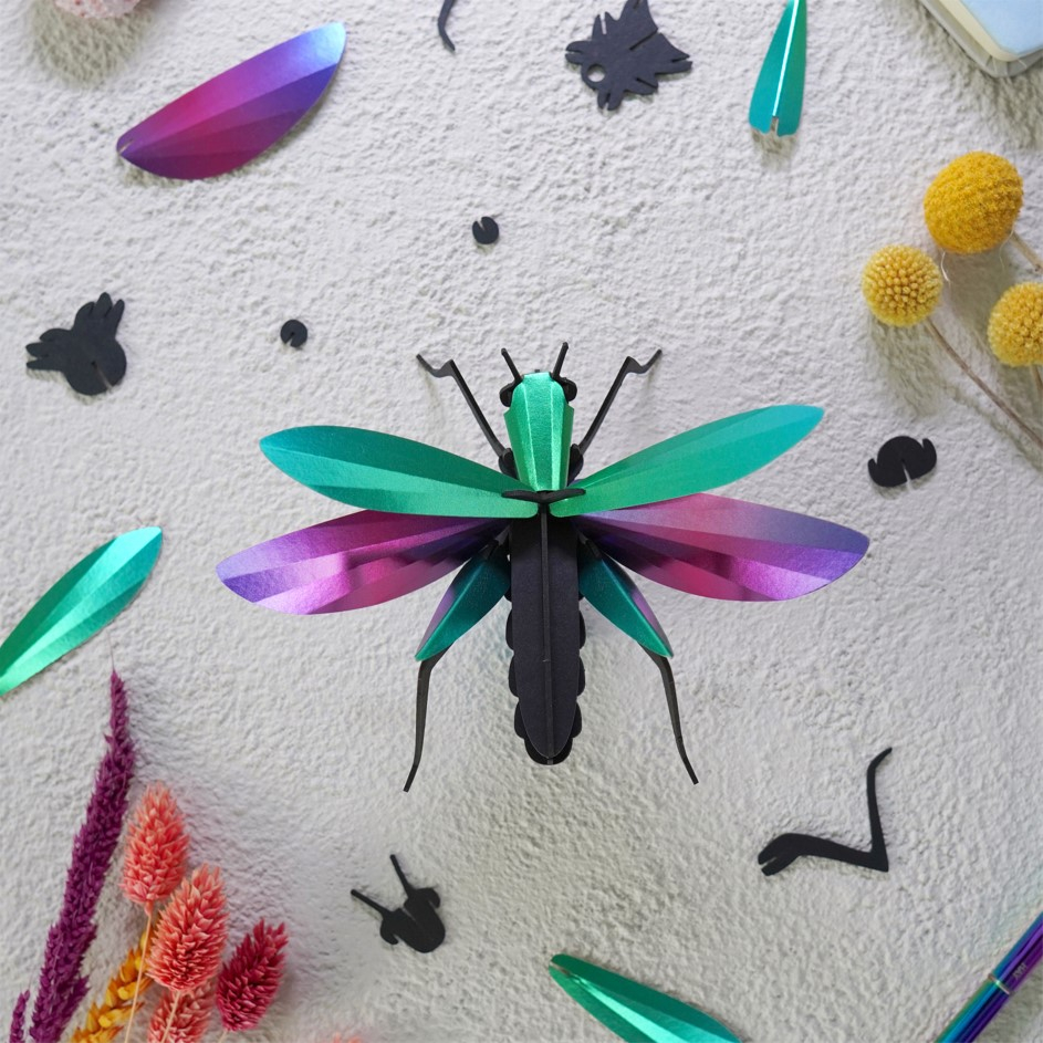 (Ref. EC1511)Ce kit DIY Sauterelle en papier contient un puzzle 3D coloré aux reflets métallisés, facile à assembler pour décorer la maison.