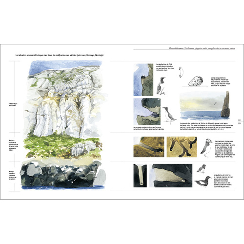 de nombreux dessins (crayon, aquarelle) qui illustrent les comportements : techniques de chasse, parades nuptiales, vol ou nage, élevage des jeunes, défense territoriale ou encore façon de se nourrir,