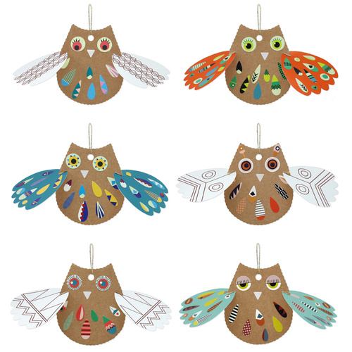 Voici 6 adorables chouettes à confectionner, à colorier et à suspendre grâce au joli fil doré fourni.