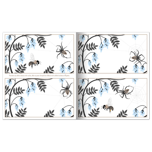 Abeille fait des allers-retours, de la ruche aux fleurs, des fleurs à la ruche. En passant, elle observe la drôle de chose que tisse l’araignée Épeire et, distraite, finit par s’y prendre !