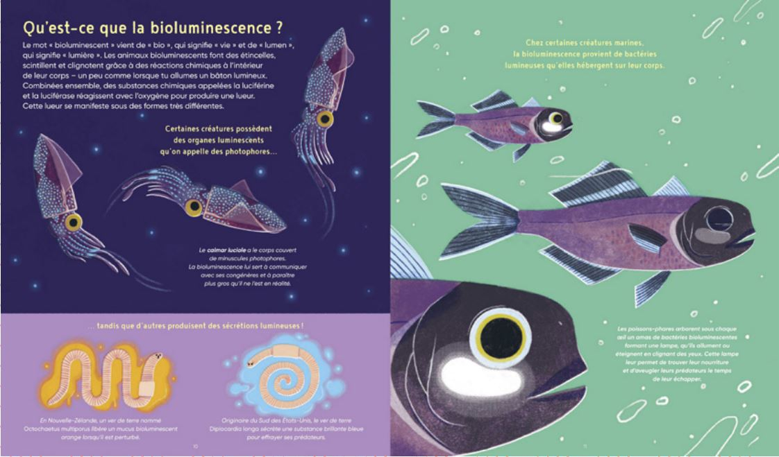En outre, une rubrique intitulée « exactement comme toi » signale les points communs entre êtres humains et animaux (la lumière pour communiquer, pour se défendre…). Ainsi, l'attention des jeunes lecteurs est encore plus captée par cette thématique fascinante !La relecture scientifique du livre a été assurée par Cassius V. Stevani, universitaire brésilien spécialiste du sujet.