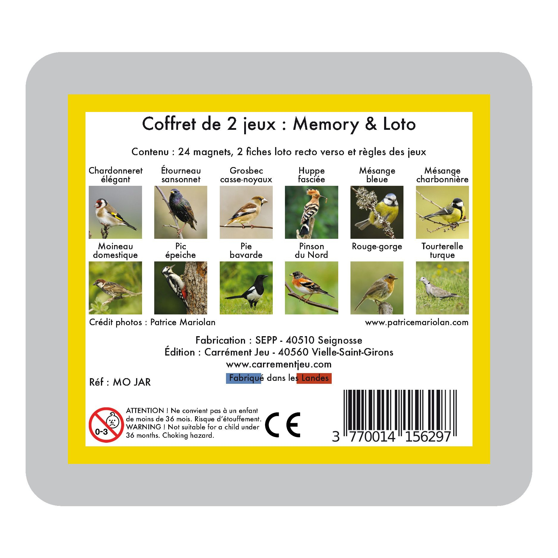 Ce Memory est original car les paires sont constituées du même oiseau en position statique et en mouvement. Avec le Loto, les joueurs vont devoir observer, retrouver des détails, nommer et reconnaitre les oiseaux.
