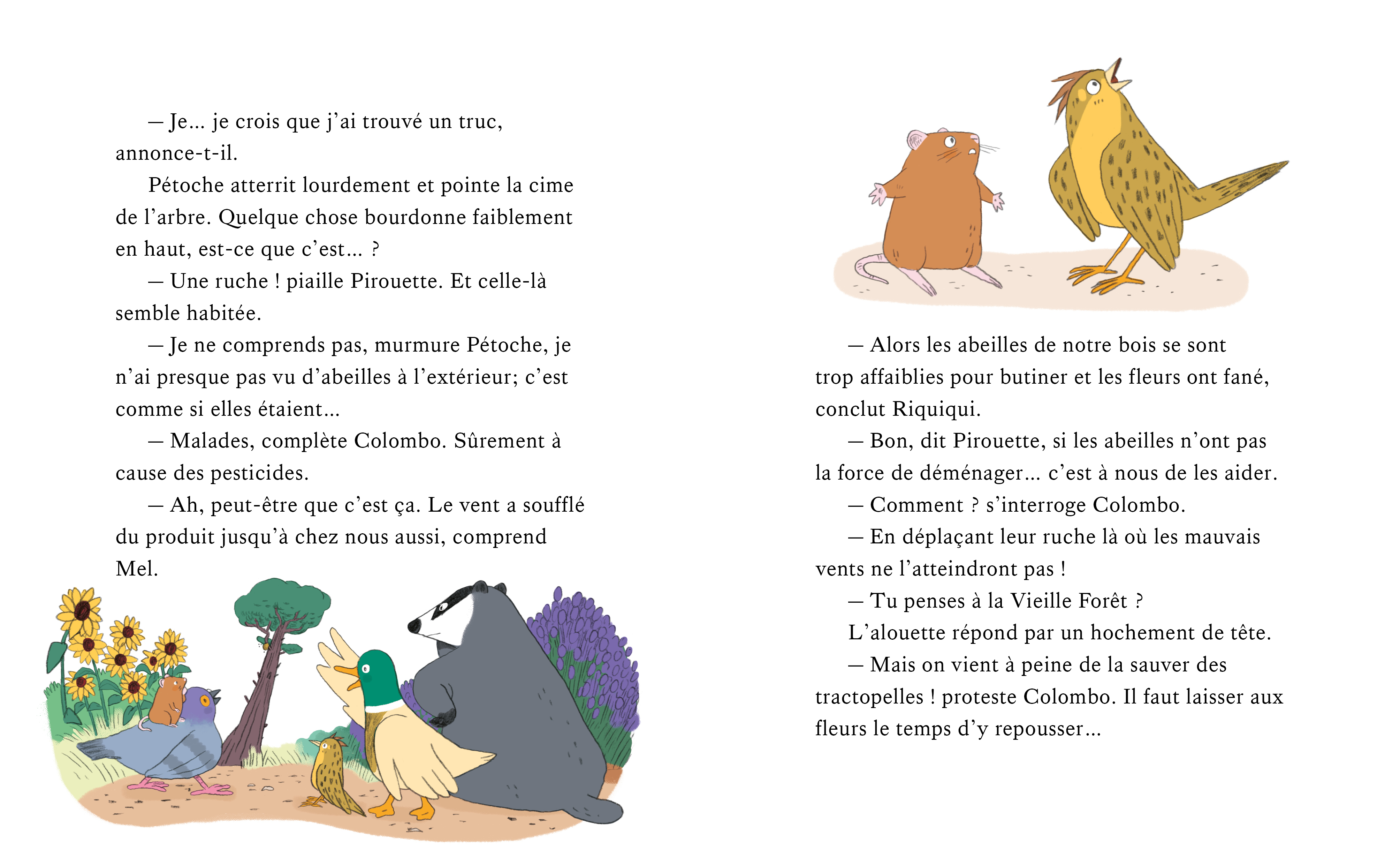 Un blaireau et un campagnol qui passaient par là, les voient étonnés et leur annonce qu’eux aussi s’interrogent… Ils surveillent même une ruche abandonnée. Des fleurs, il y en a plein la vallée… mais ici, elles ne poussent presque plus. Alors, tous ensemble, ils décident d’enquêter.