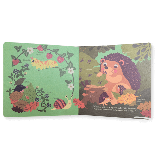 Oh, un petit faon ! Et là, de belles fraises des bois. Tourne la page… voici le hérisson qui se cache sous les feuilles. Promène-toi dans la forêt avec ce bel imagier ajouré, rencontre les animaux et les plantes sauvages, apprends leurs noms et leurs secrets.