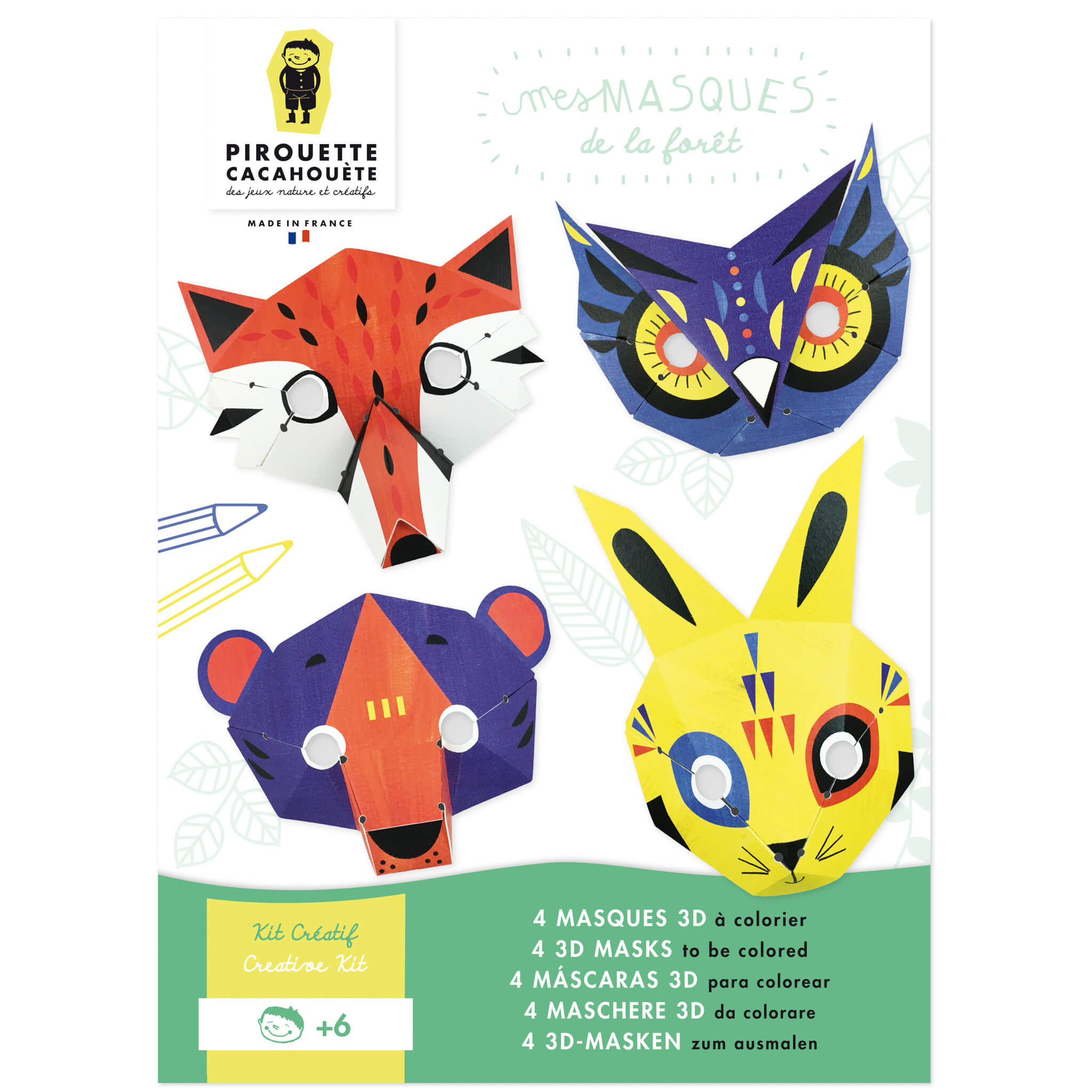 Le kit créatif Mes masques de la forêt est une activité ludique et éducative qui encourage les enfants à explorer leur imagination tout en développant leurs compétences manuelles. Fabriqué en France à partir de papier certifié, ce coffret se compose de quatre masques représentant des animaux emblématiques de la forêt : le lapin, l'ours, le renard et le hibou.