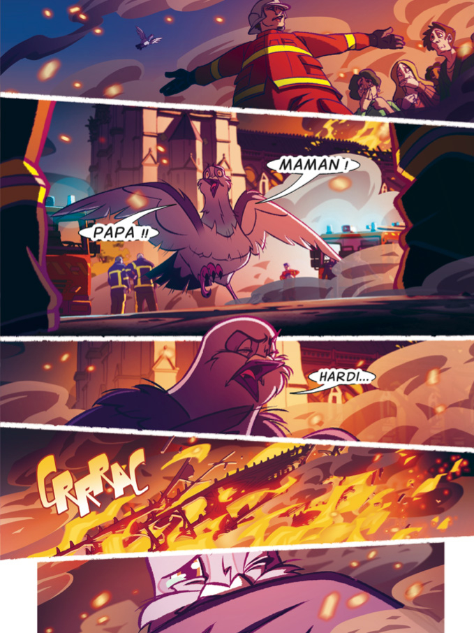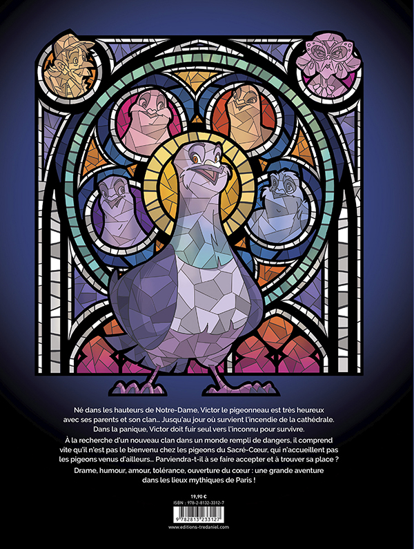 Adaptée du roman du même nom, la bande dessinée Victor de Notre-Dame, illustrée avec finesse par Julia Robin et Charles Ferry, et écrite par Val Reiyel, plonge les lecteurs dans une aventure unique. Elle raconte l’histoire de Victor, un jeune pigeon né dans les hauteurs emblématiques de Notre-Dame de Paris. Heureux auprès de ses parents et de son clan, sa vie bascule lorsque l’incendie de la cathédrale l’oblige à fuir seul.
