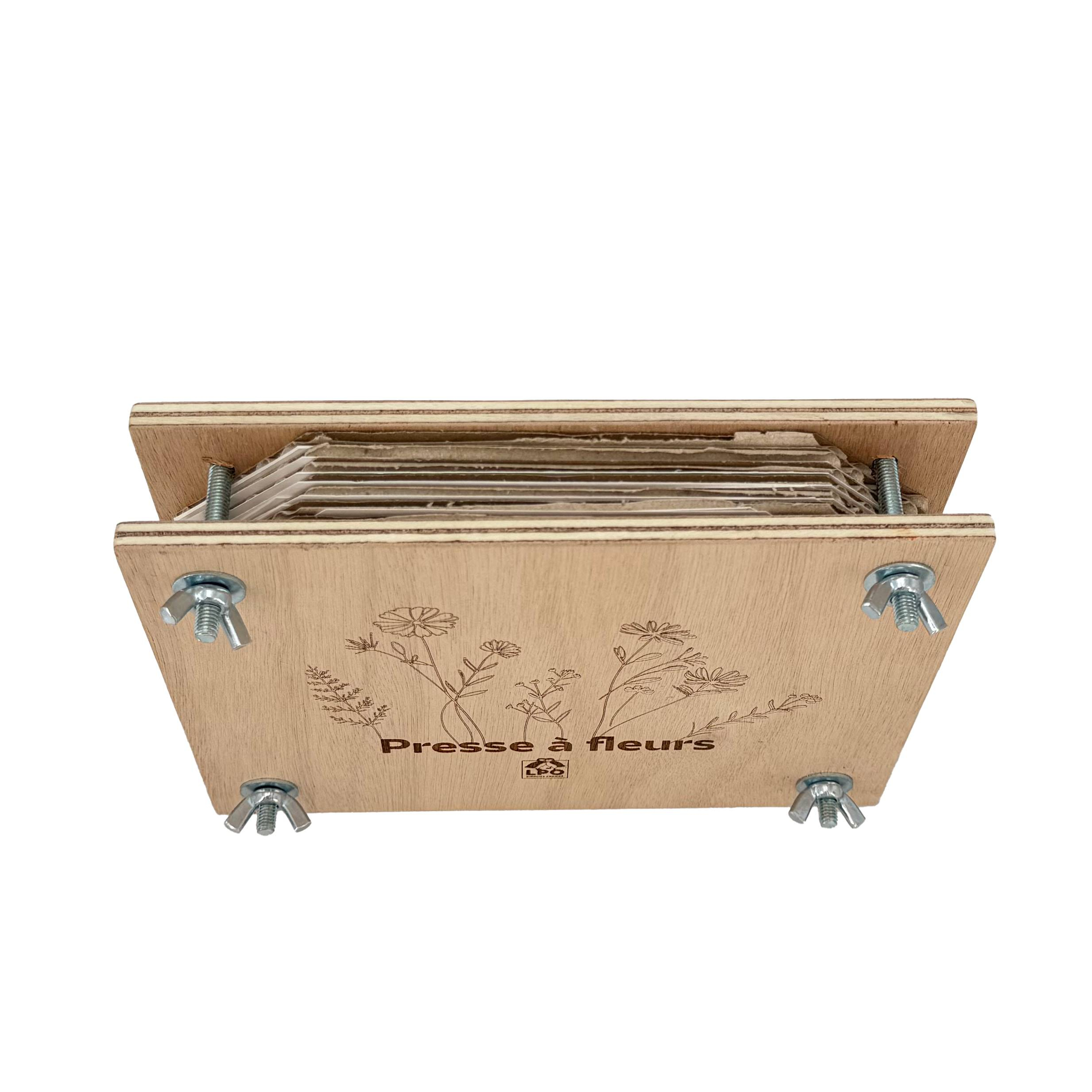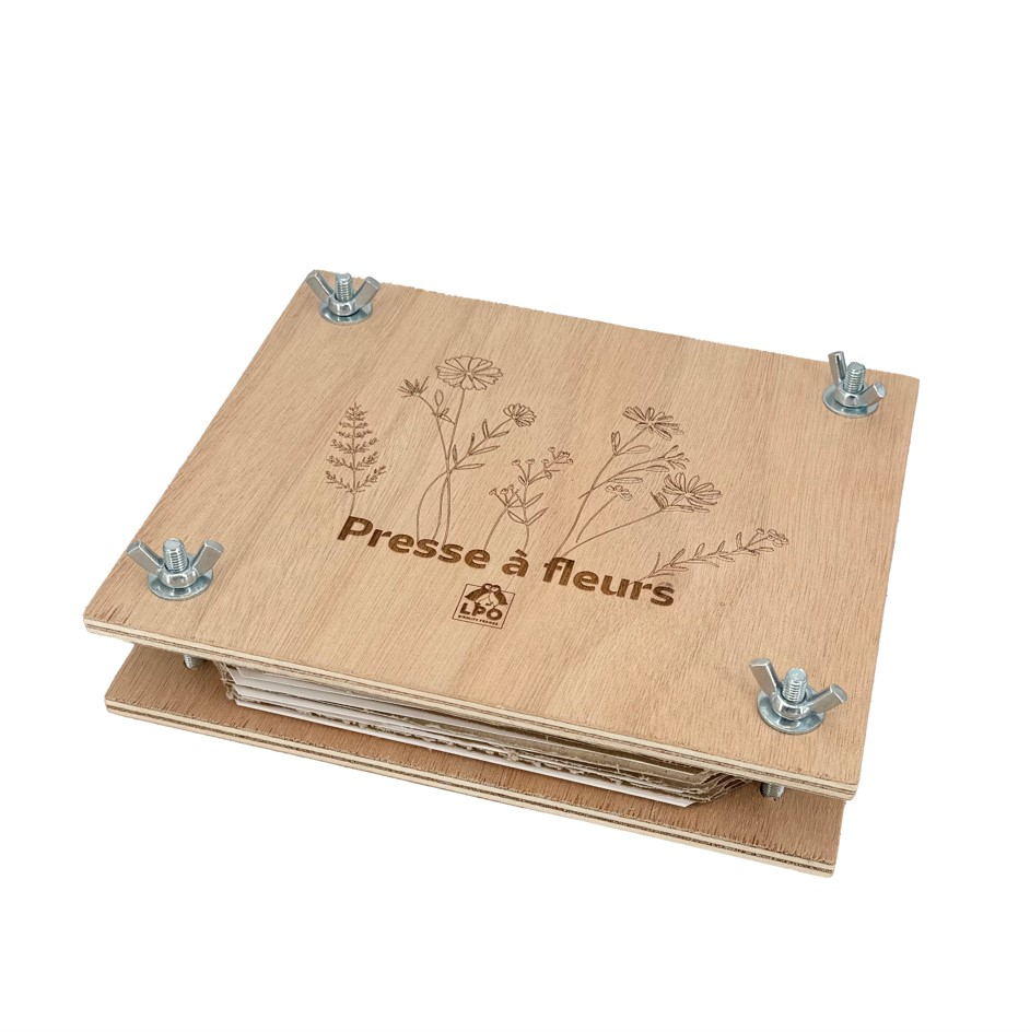 Le Presse à fleurs LPO, fabriqué en France, est conçu en bois de peuplier issu de forêts françaises gérées durablement. Il est orné de délicats motifs floraux gravés, apportant une touche esthétique à cet outil pédagogique.