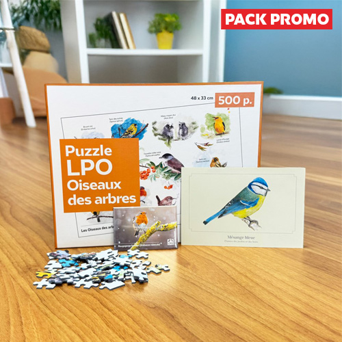Le Pack Oiseaux des jardins réunit trois créations autour des espèces emblématiques de nos jardins, dans un ensemble à la fois ludique, pédagogique et décoratif. Il comprend le puzzle LPO Oiseaux des arbres de 500 pièces, le magnet LPO Rougegorge fabriqué en France, ainsi qu'une carte postale simple illustrée d’une Mésange bleue.