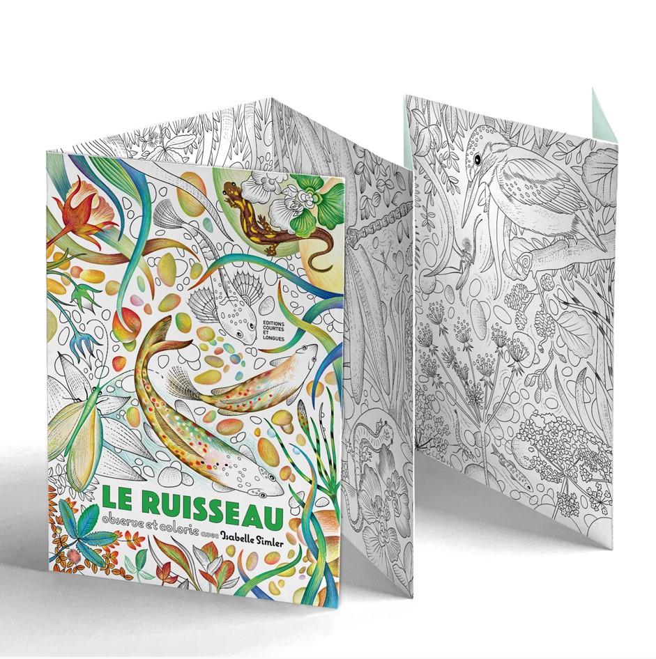Conçu par Isabelle Simler, cet album de coloriage pour enfants propose, au recto, des dessins naturalistes du ruisseau et des animaux qui y vivent, à colorier librement selon l'inspiration de chacun. Le verso, à visée documentaire, identifie et référence précisément les noms, formes et couleurs de chaque plante, animal et roche représentés. Cette approche permet de relier la création libre à une connaissance fine de l'univers aquatique.