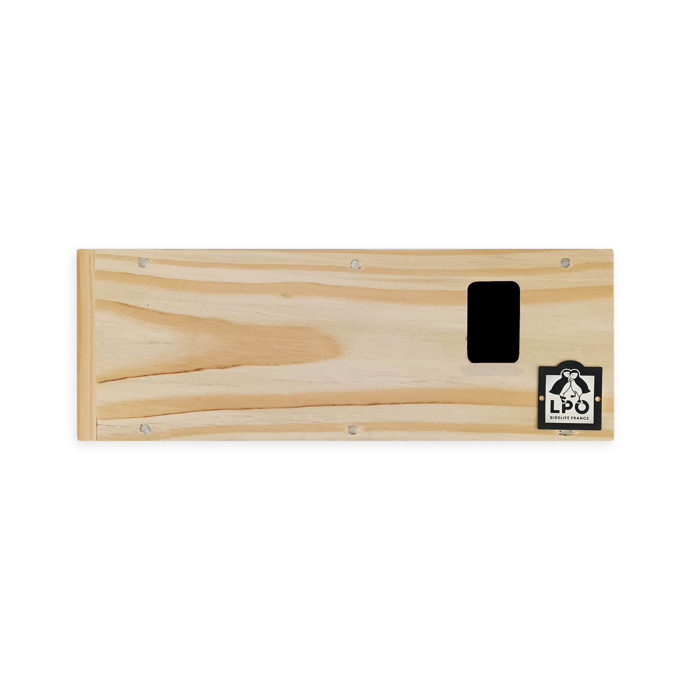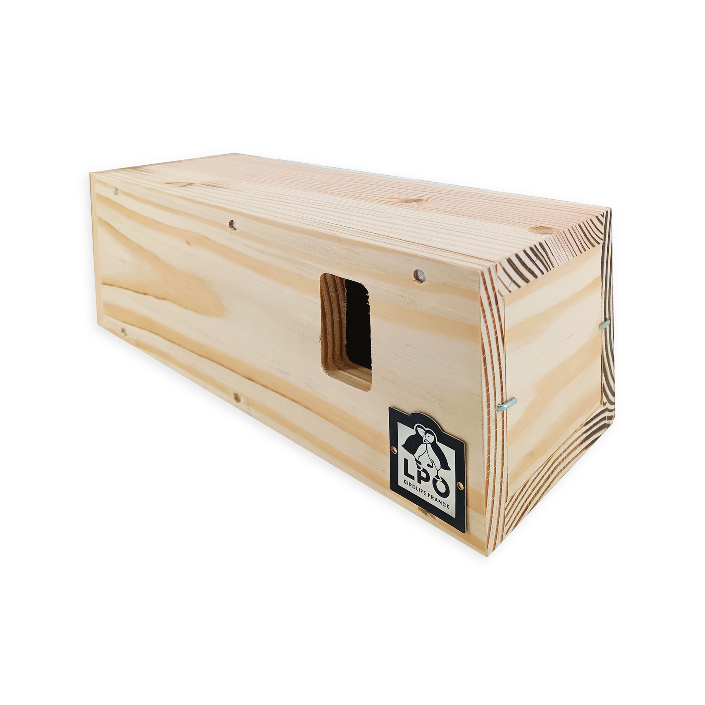 Conçu par la LPO et fabriqué par en ESAT avec du bois issu de forêts gérées durablement, ce nichoir d'une longueur de 34 cm est étudié pour accueillir les moineaux domestiques ou friquets.