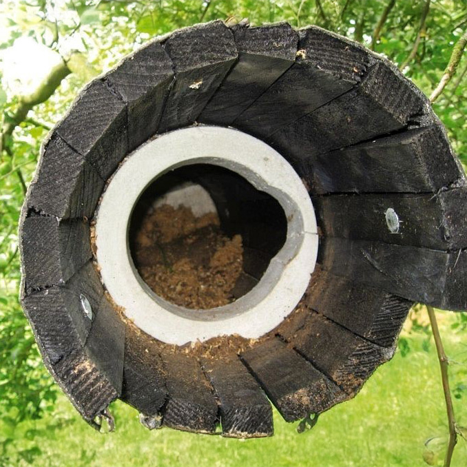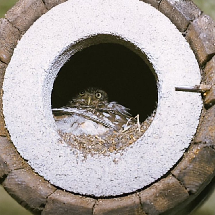 Un développement innovant des nichoirs cylindriques pour chevêches d'Athéna, couronné de succès depuis de nombreuses décennies. Livré avec les bandes nécessaires à la fixation sur les branches horizontales.
