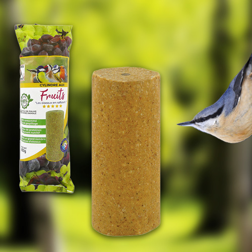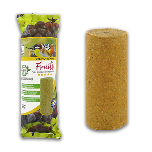 Offrez aux oiseaux un repas complet avec ce cylindre aux fruits, à base de graisse végétale (sans huile de palme) et de céréales.