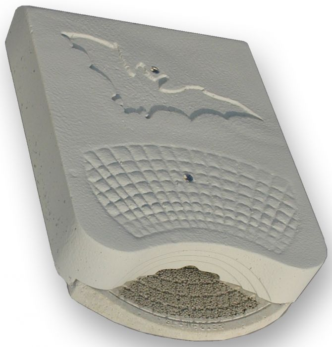 La partie supérieure est décorée d'une silhouette représentant une chauve-souris. Le secteur structuré et réservé à l'accès, qui offre de bonnes possibilités d'accrochage aux animaux, se trouve au-dessous de cette silhouette. Il est pourvu de petits gradins ce qui accélère l'acceptation du gîte, également par les jeunes animaux inexpérimentés. Le gîte 1WQ livré est recouvert d'une peinture grise résistante aux intempéries. Il peut être recouvert avec la même peinture pour façade que celle où il est fixé. -