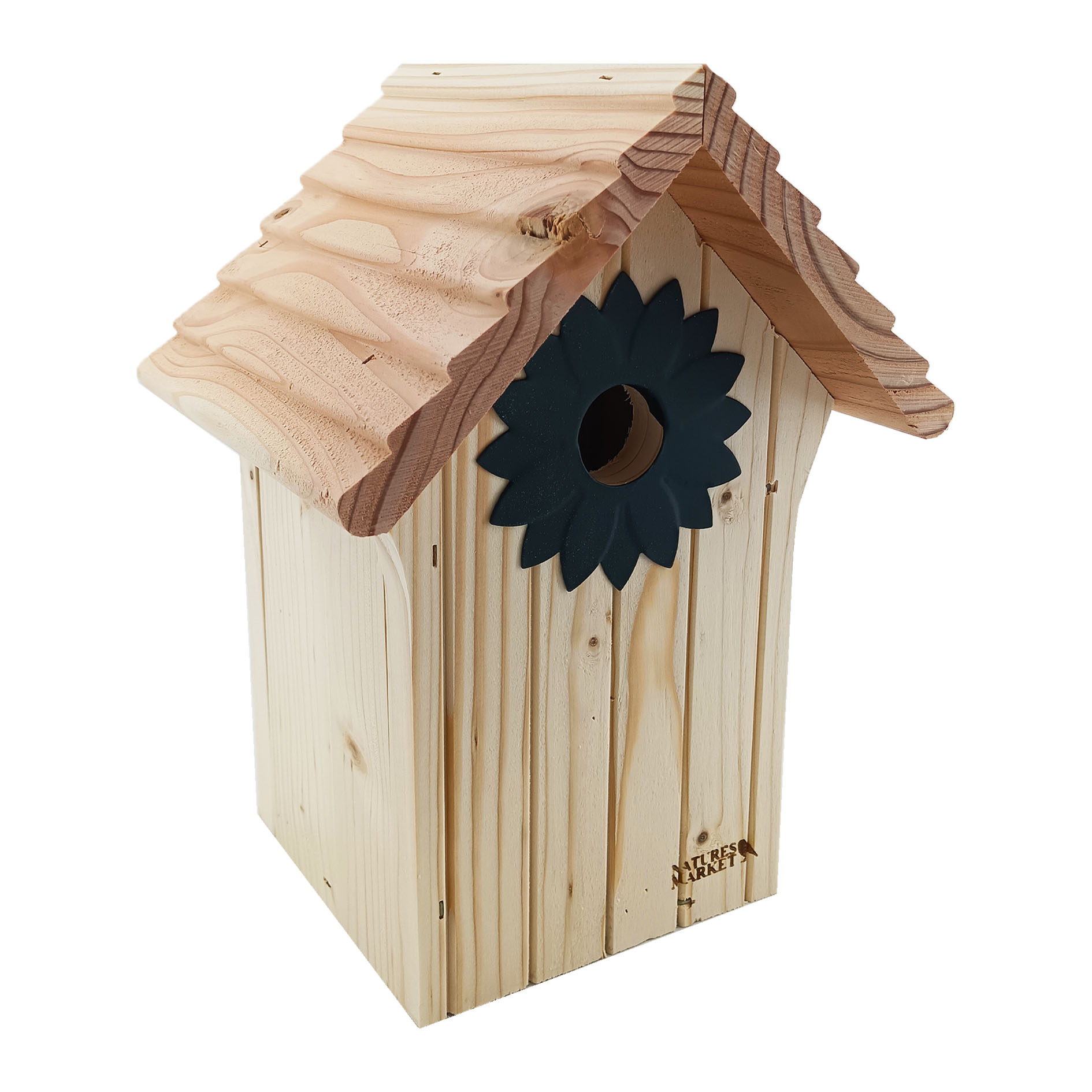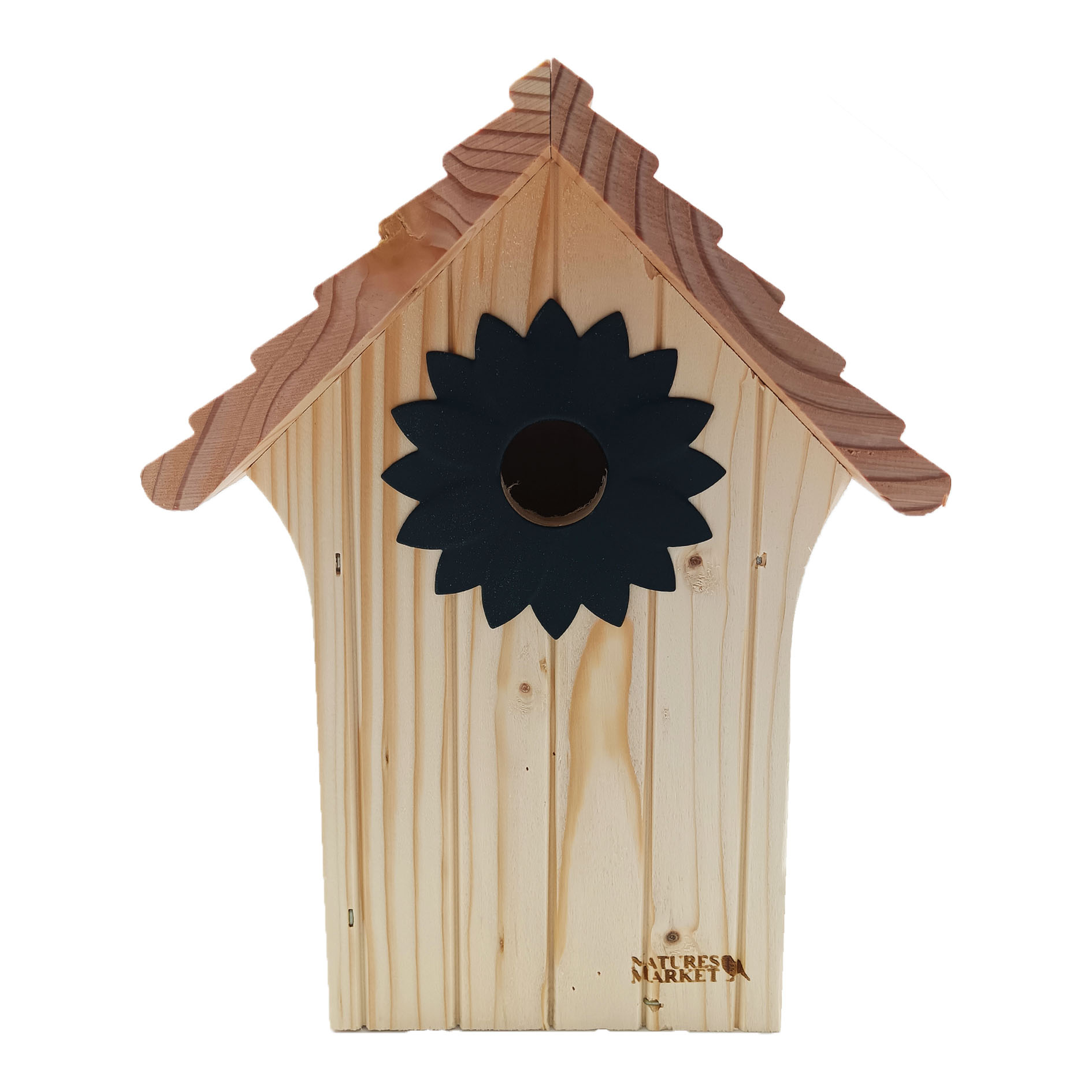 Ce joli nichoir est muni d'une attache pour la suspension et d'une plaque de protection du trou d'envol en forme de marguerite en métal.