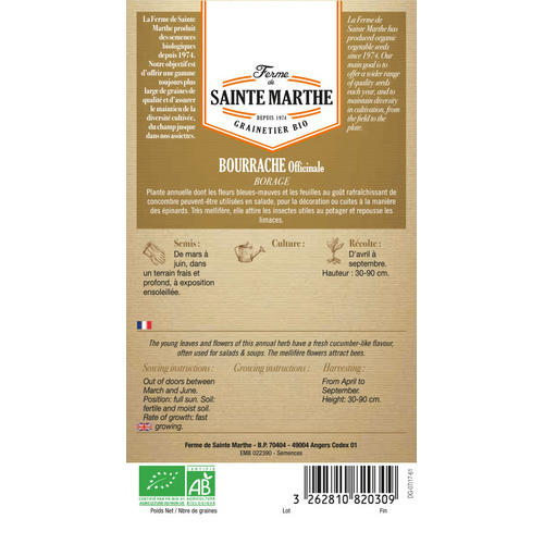 La bourrache officinale aime le soleil, les sols riches, profonds, drainés et frais. En mars, ratissez votre sol avant de semer les graines à la volée et de les recouvrir légèrement, puis arrosez-les avec une pluie fine. Il faut éclaircir les plants et leur laisser 40 cm d’espace chacun. Jeune, la plante demande un arrosage régulier, elle n’apprécie pas la sécheresse. Un paillage permet de limiter l’évaporation de l’eau.