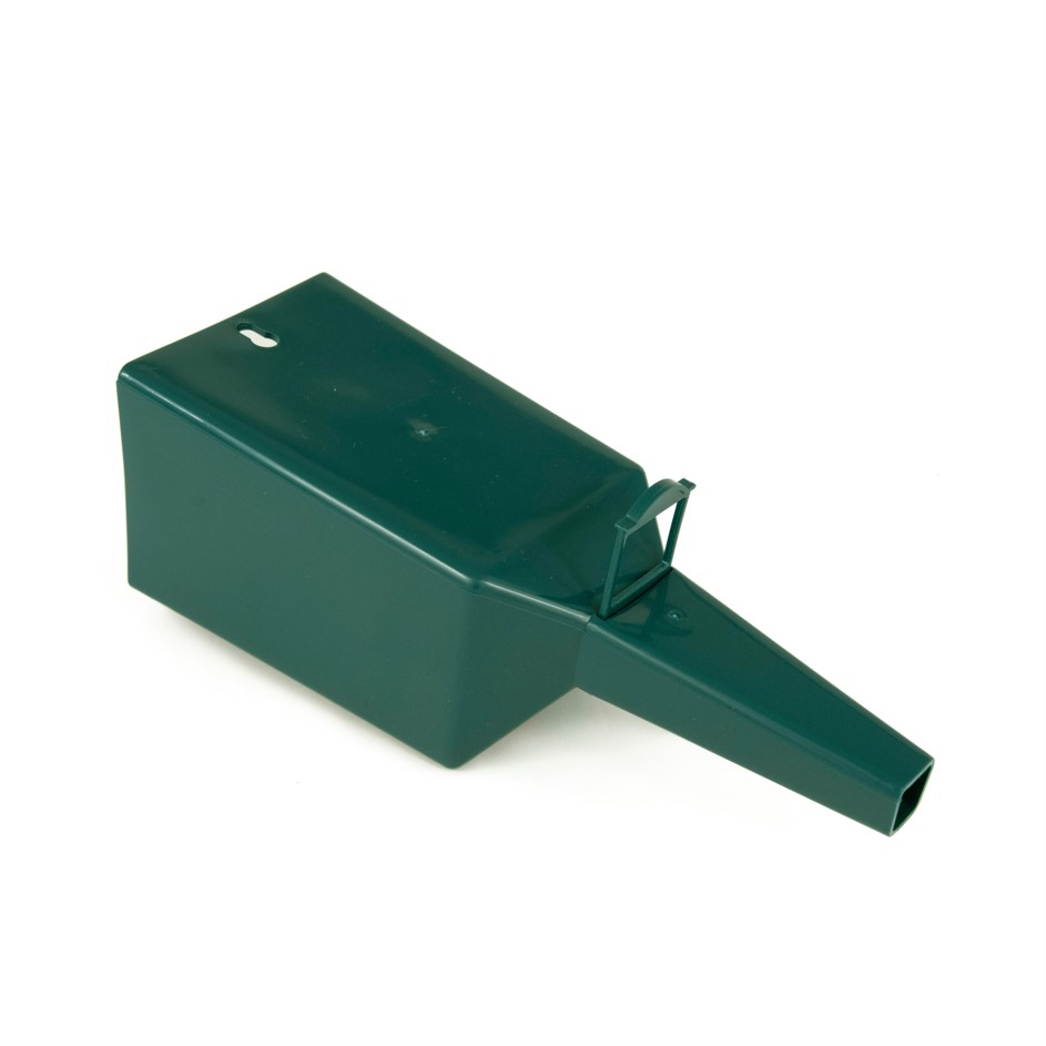 Cette pelle à graines avec doseur est pratique pour prendre de la nourriture dans un seau et la déverser dans un silo grâce à son entonnoir.