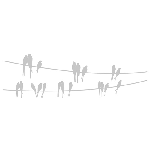 Ce lot est composé d'une planche de 2 stickers (d’environ 95 cm chacun sur une hauteur de 20 cm) représentant des hirondelles sur un fil. Vous pouvez découper la planche afin de les aligner pour former une longue frise.