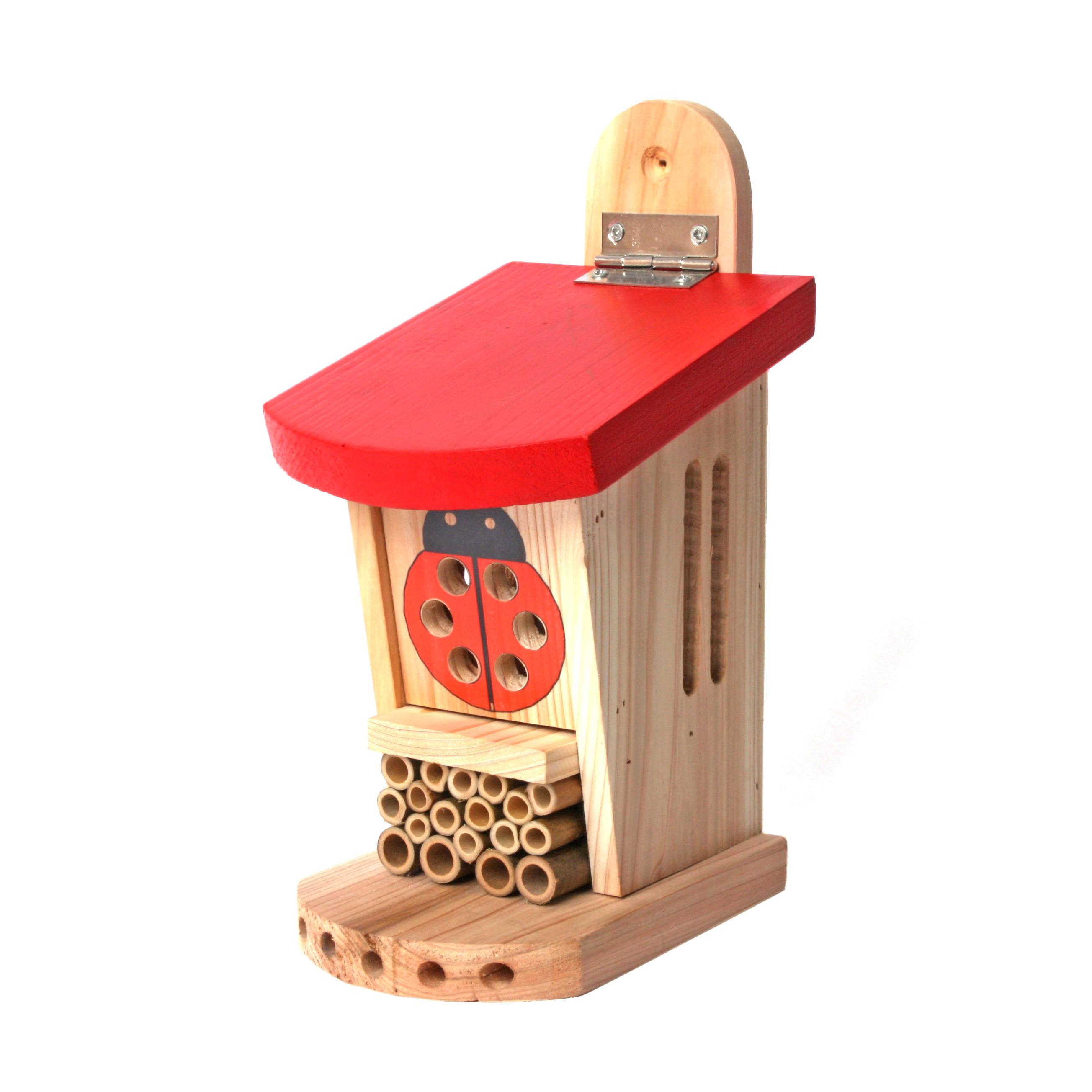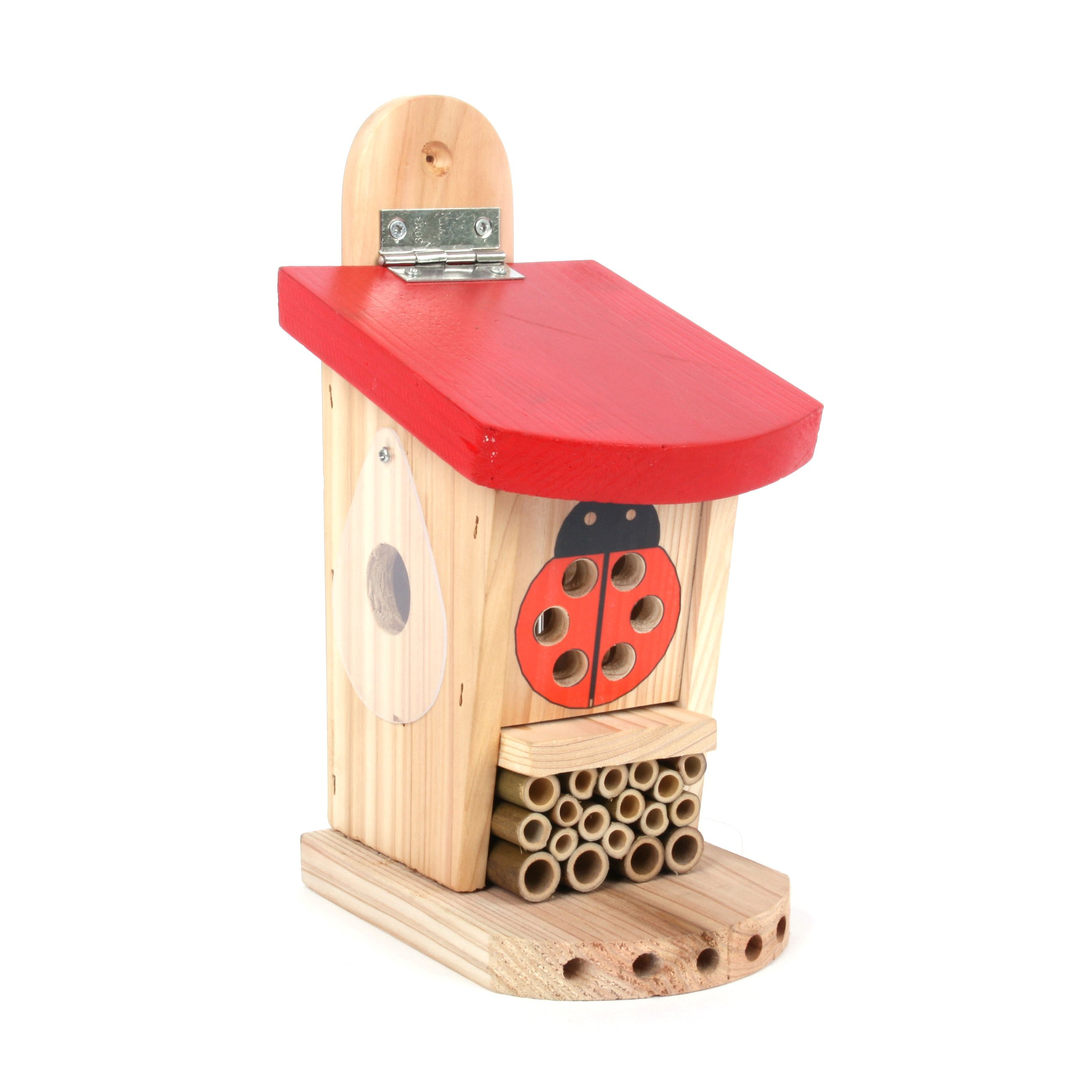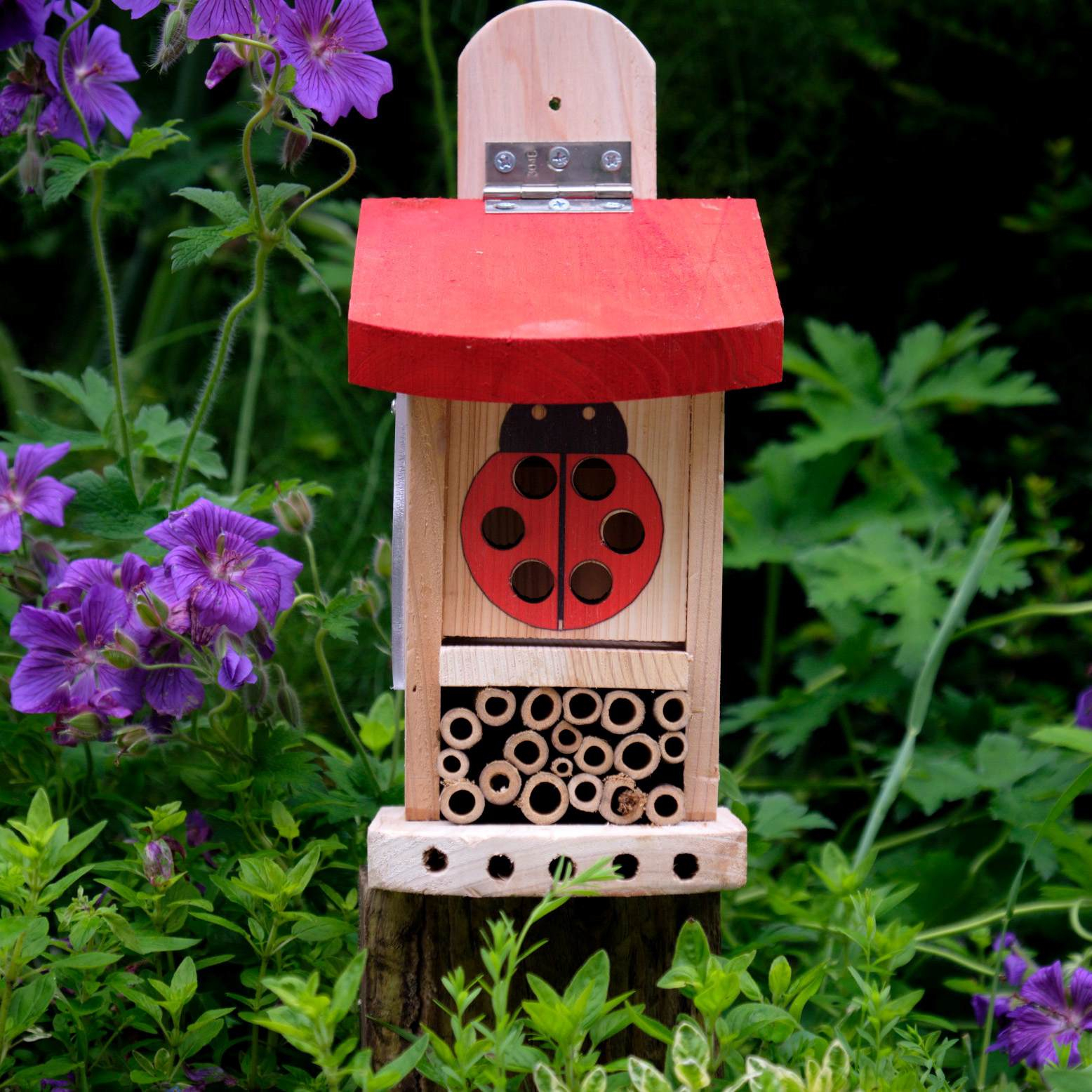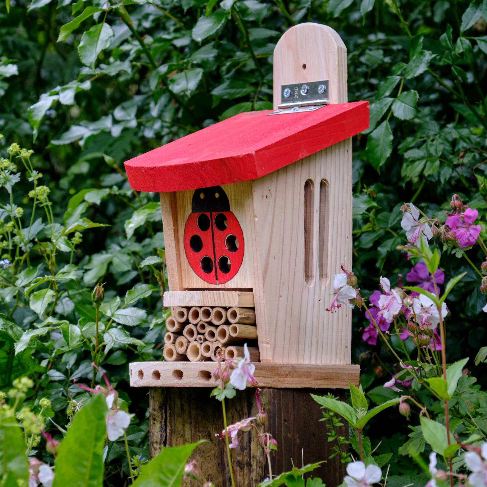 Dotée d’un toit à charnière, vous allez pouvoir introduire différents matériaux naturels à l’intérieur, comme des boutures de rosiers, des brindilles, des écorces et du paillage pour améliorer l’habitat. Une petite plaque pivotante en plexiglas a été installée sur le côté afin que vous puissiez observer les coccinelles sans les déranger.