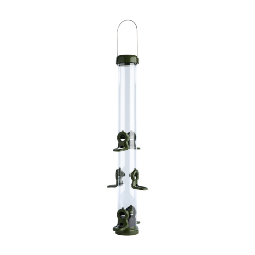Le silo à graines Ring Pull Click est une mangeoire ultra résistante grâce à son tube en polycarbonate et son capot, son fond et ses ports (perchoirs) en acier traité.