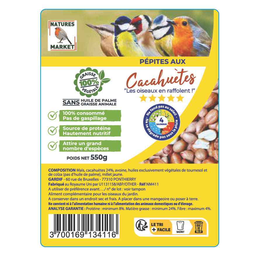 Les pépites sont économiques car 100 % consommées par les oiseaux : sans gaspillage ni résidu. Ces aliments ne fondent pas à la chaleur et résistent au froid et à la pluie.