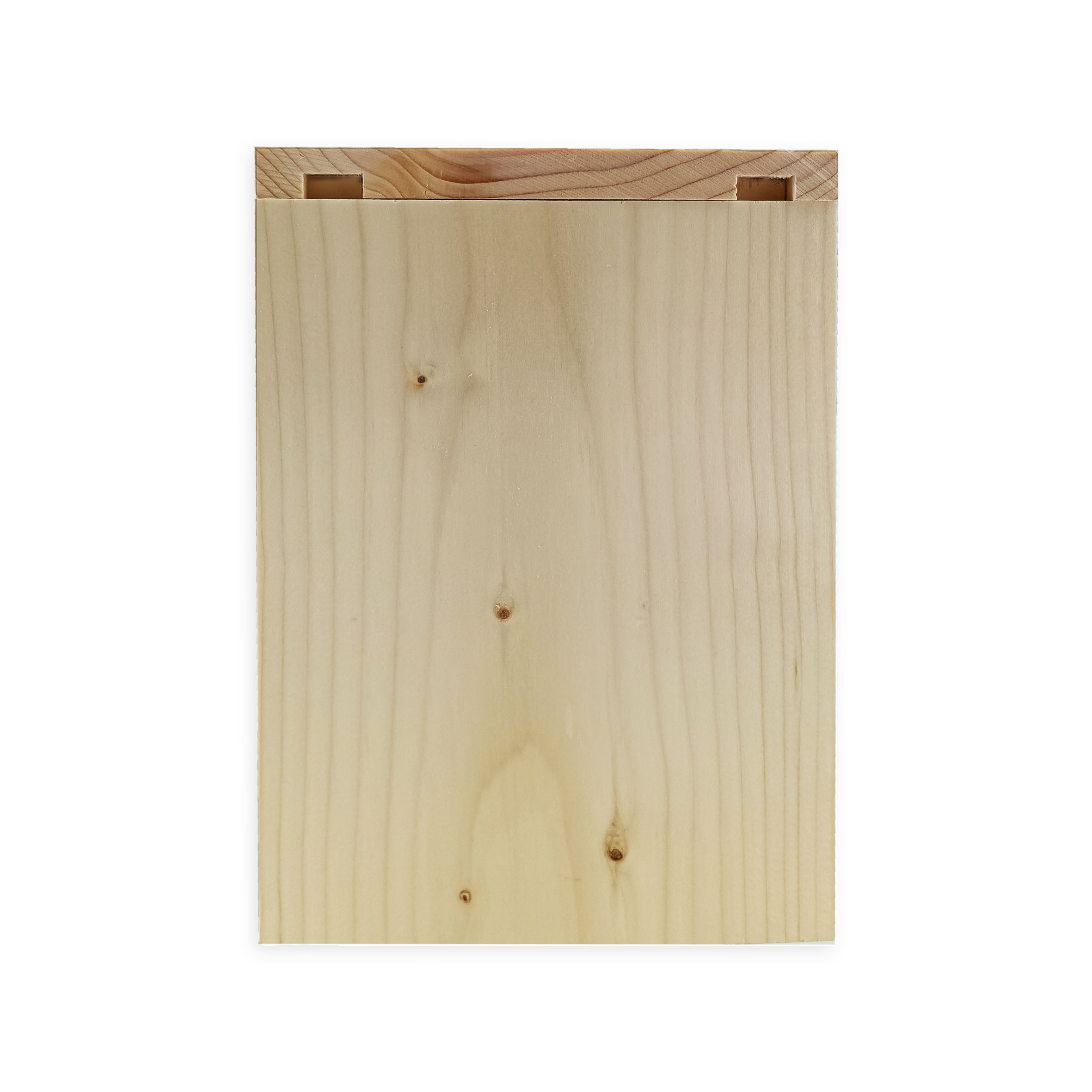 Les différentes parties du nichoir s’encastrent et se clouent. La porte avant coulisse dans ses rainures puis se visse.