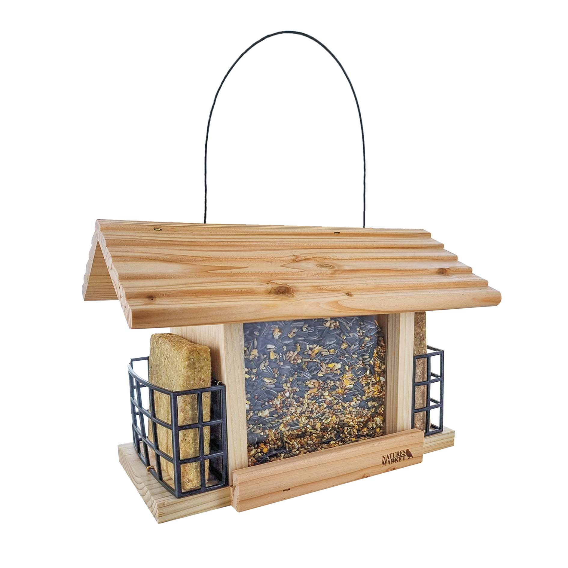 Le toit coulisse pour remplir le compartiment central, les plaques en plastique polycarbonate s'enlèvent pour un nettoyage facile à l'aide d'un kit de nettoyage pour mangeoires.