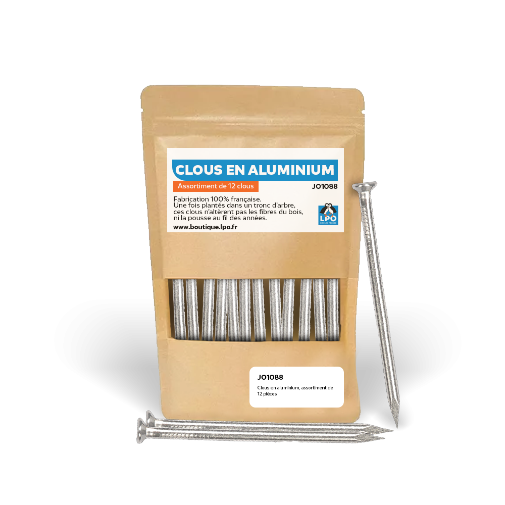 Pour l'installation de nichoirs oiseaux ou de gîtes à écureuils, par exemple, nous vous proposons des clous en aluminium. Une fois plantés dans un tronc d'arbre, ces clous n'altèrent pas les fibres du bois, ni la pousse au fil des années. D'une longueur de 8cm, ces clous vous garantissent une fixation solide et durable. Une fabrication 100% française.