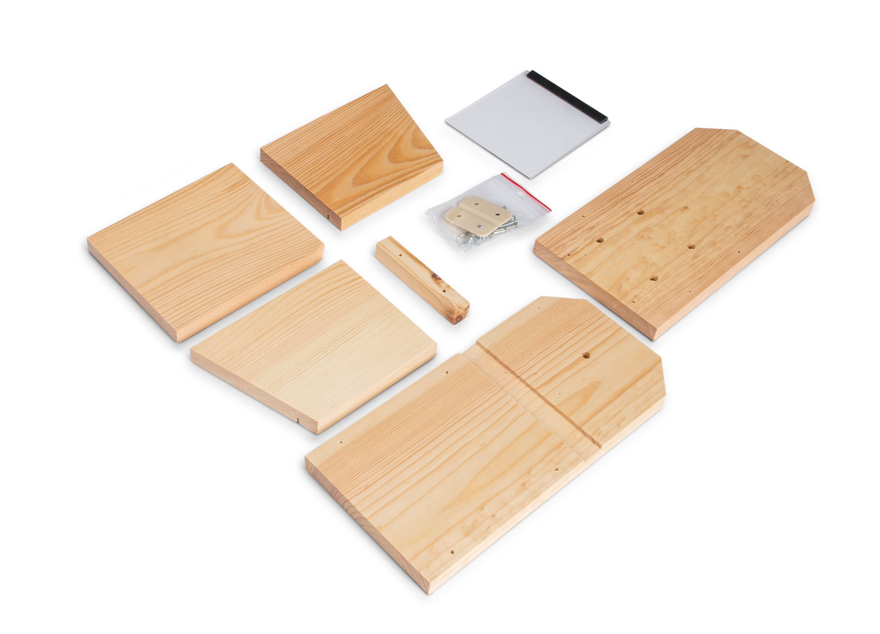 Toutes les pièces de cette mangeoire ont été fabriquées sur-mesure, en bois issu de forêts gérées durablement. Les trous destinés aux pointes sont déjà perforés.