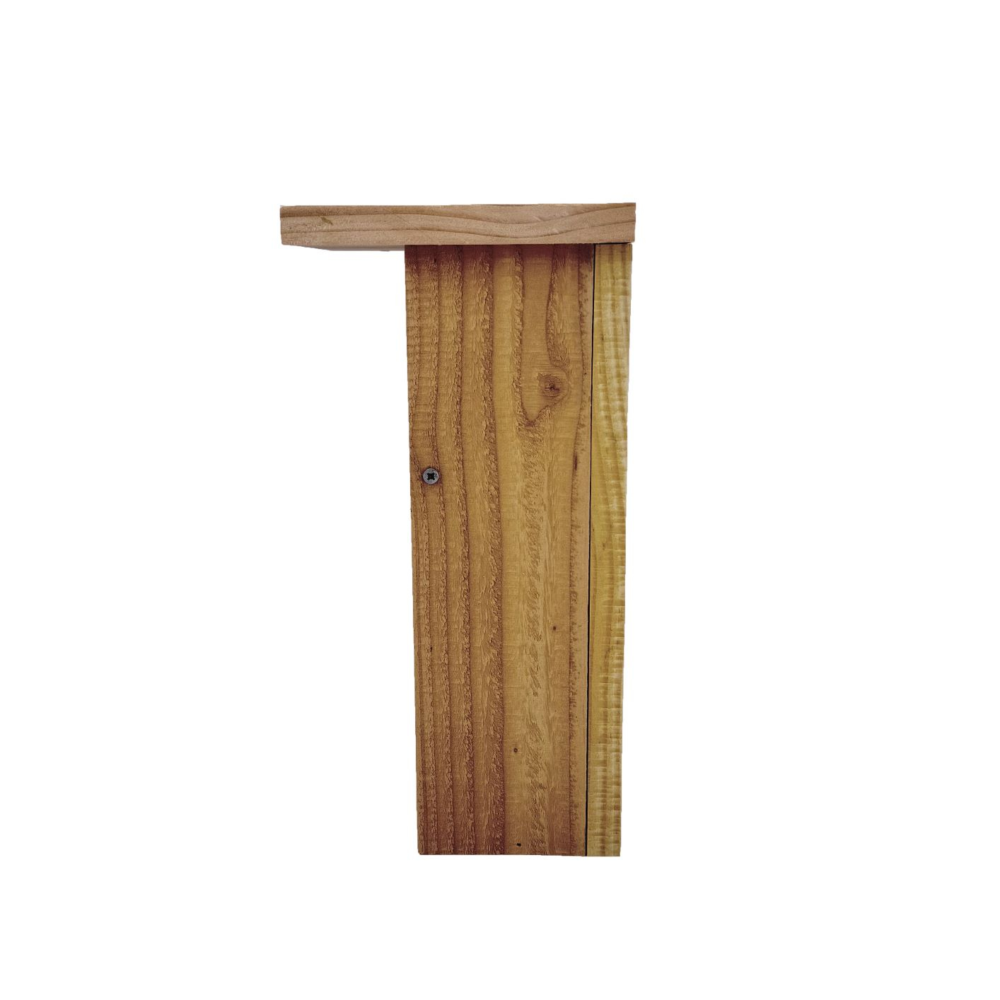 En cas de nécessité, pour contrôler le nichoir, la porte pivote en retirant la vis présente en façade. Des vis sont également fixées sur chaque côté. Elles se retirent pour enlever la porte et nettoyer le nichoir.