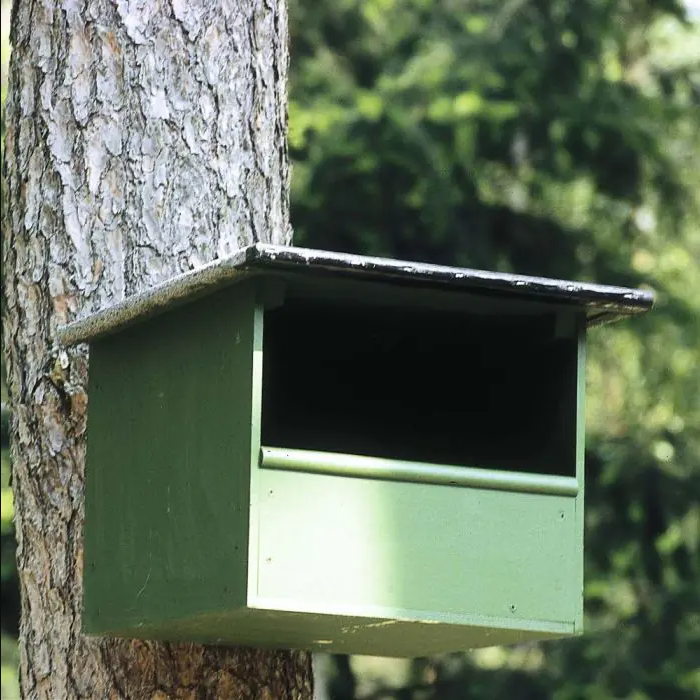 L'emplacement idéal pour ce nichoir est à une hauteur d'au moins 5 mètres, orienté de préférence au sud-est, avec une trajectoire de vol dégagée. À l'intérieur, déposez un lit de copeaux de bois ou d'écorce déchiquetée qui servira de "matelas doux" pour les œufs. Evitez la sciure ou la terre qui pourraient obstruer les trous de drainage.