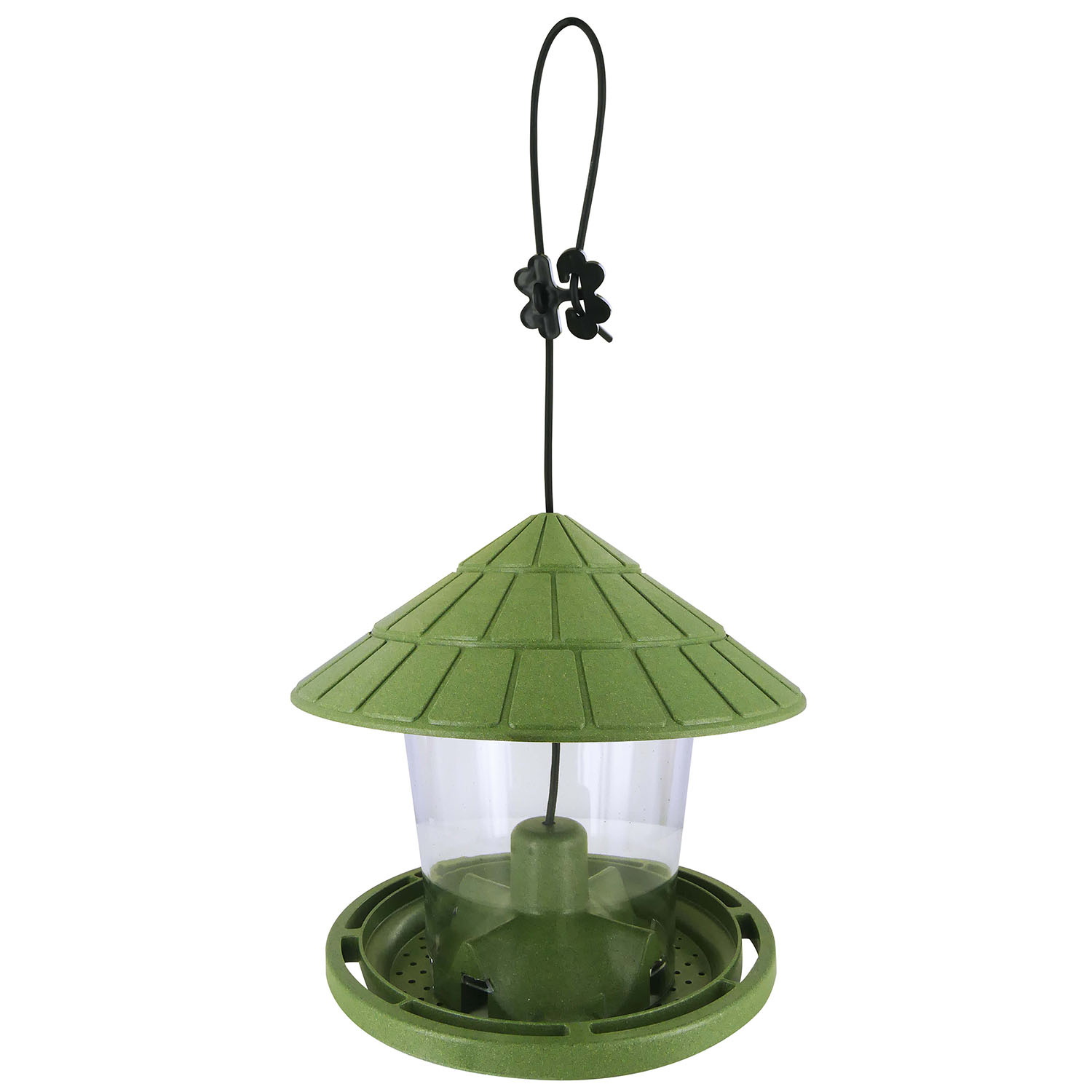 (Ref. JO1169)Mangeoire colorée à suspendre, 100% plastique recyclé, dotée d'un large toit vert et d'une grande base perforée, avec perchoir