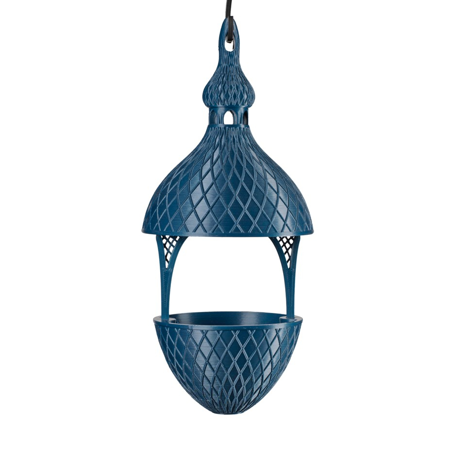 (Ref. JO1221)Une mangeoire au design original, à suspendre et à remplir de graines ou de boules de graisse pour nourrir les oiseaux des jardins