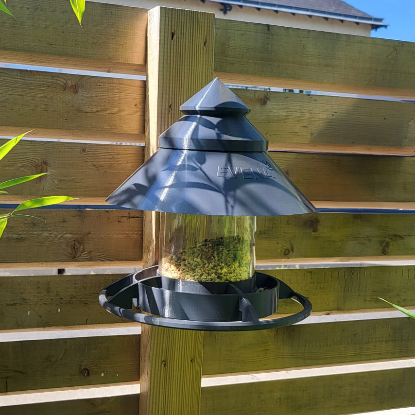 (Ref. JO1227)Elégante mangeoire à graines en plastique recyclable, pour contribuer à la supplémentation des oiseaux des jardins.