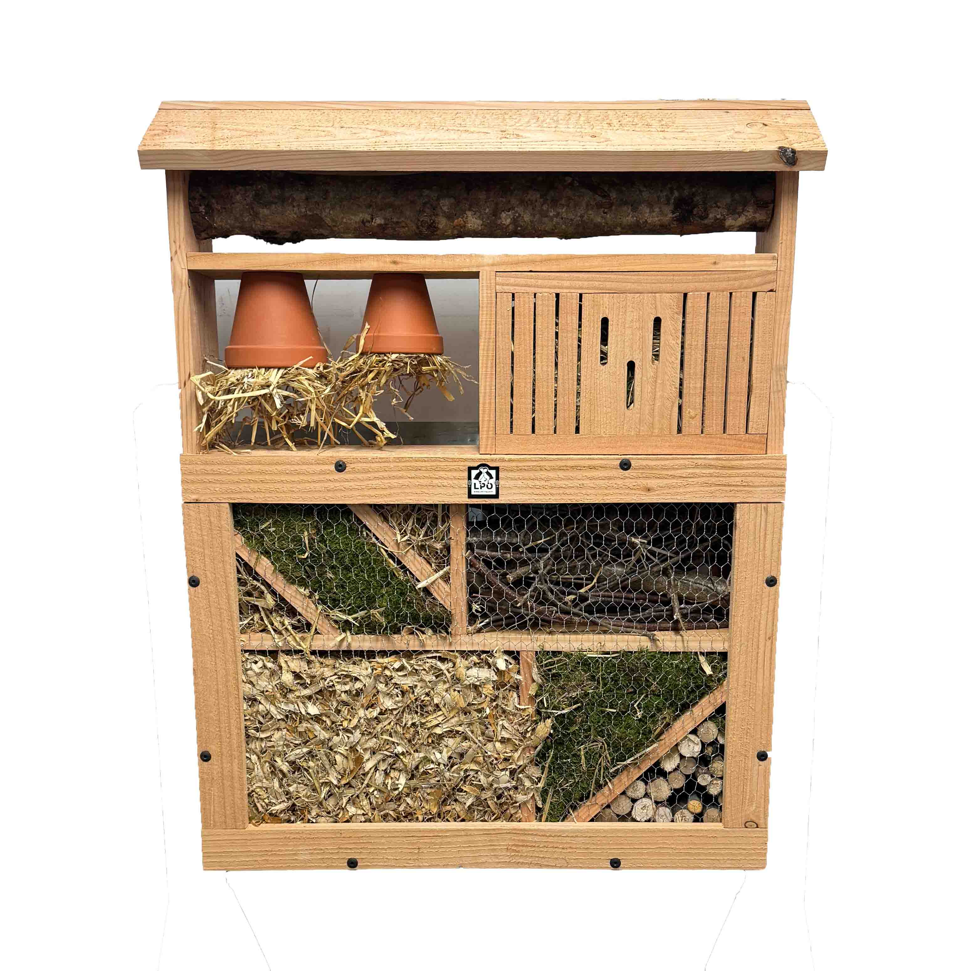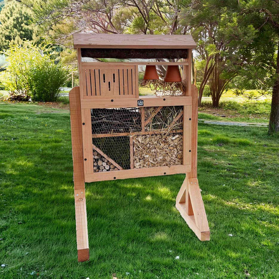 Cet hôtel à insectes est vendu seul. Vous pouvez compléter son installation avecles piètements en bois à poser ou les platines de scellement.