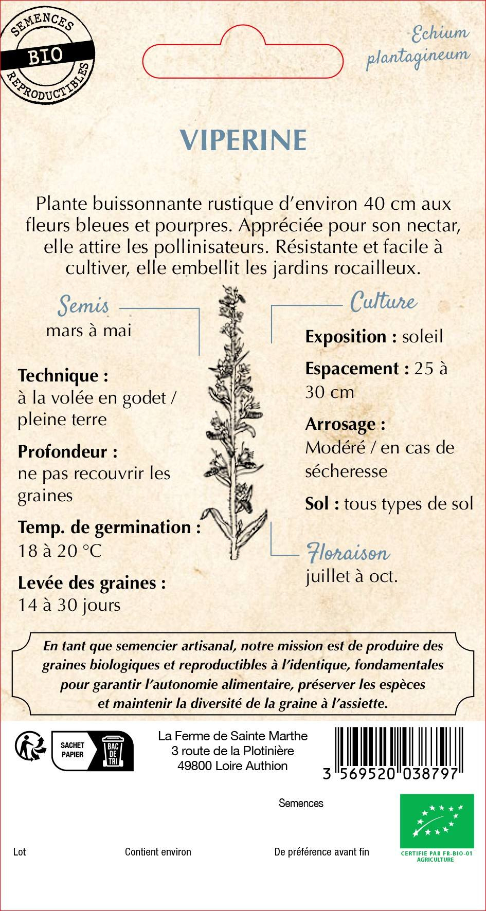 La vipérine est une bisannuelle, de près d’1 m de hauteur qui fleurit de juillet à octobre. Cette fleur mellifère de la famille de la bourrache attire les insectes pollinisateurs comme les abeilles et les papillons. En hiver, elle forme des rosaces de feuilles vertes qui recouvrent le sol. En été, elle arbore des épis de fleurs pouvant mesurer 30 cm avec un superbe camaïeu de bleu, pourpre et rose.