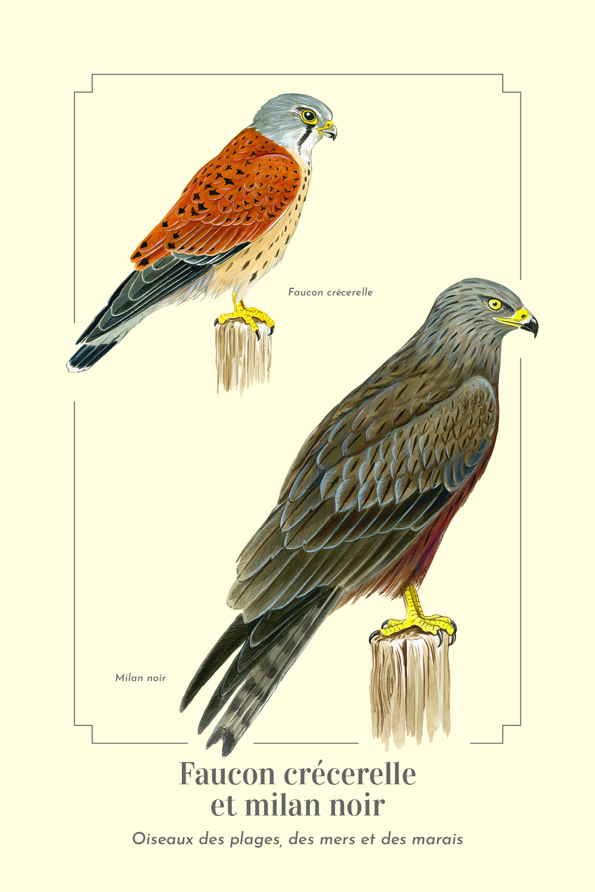 Cette carte originale illustrée d'un Faucon Crécerelle et d'un Milan noir fait partie d'une série spéciale de cartes postales sur les oiseaux du jardin et la faune sauvage de France.