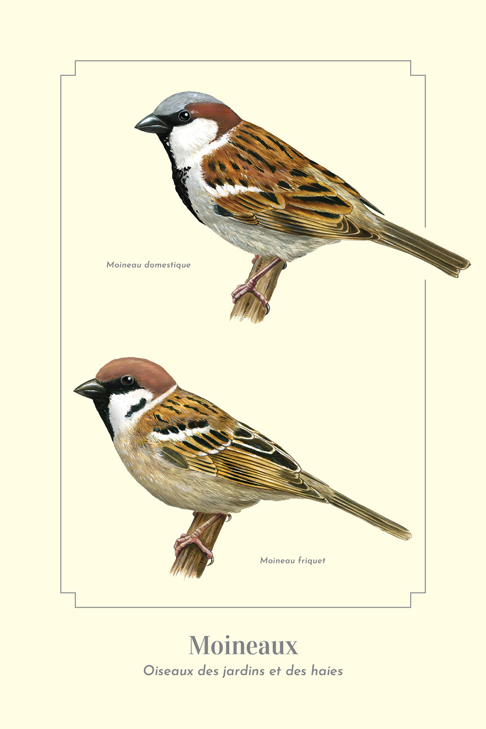 Le moineau domestique se rencontre partout alors que le moineau friquet fréquente plutôt les campagnes. Le dessus de la tête est gris chez le domestique et marron chez le friquet, avec une tâche noire sur les joues. Les deux sont grégaires. Leurs colonies peuvent atteindre une centaine d'individus. Hélas, leurs populations s'effondrent à cause des activités humaines.
