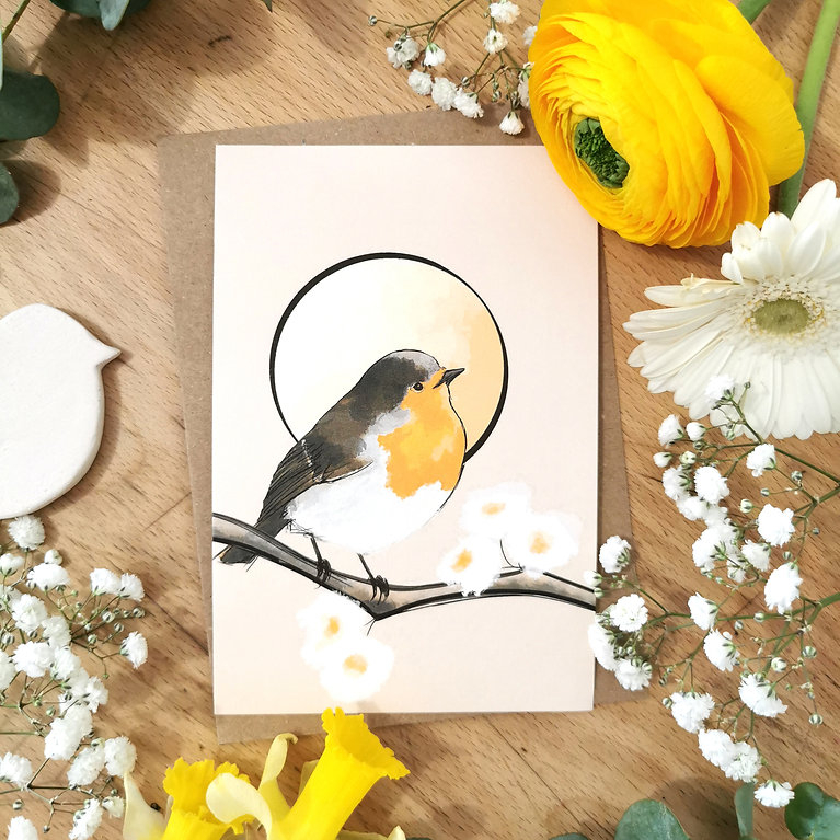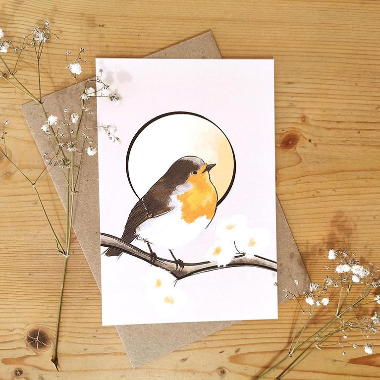 Une carte postale originale illustrée d'un Rougegorge et imprimée sur papier épais.