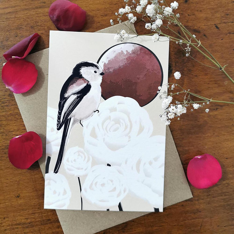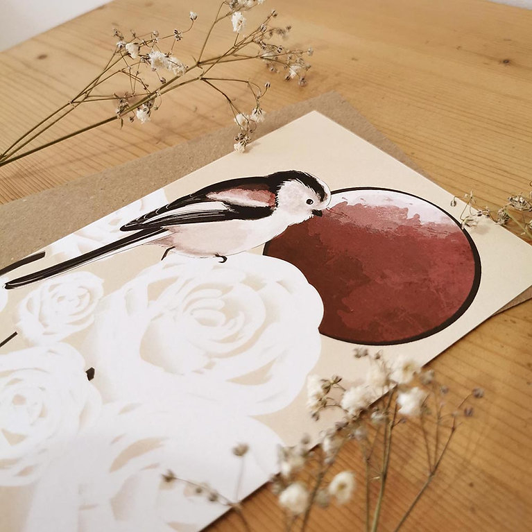 Une carte postale originale illustrée d'une Mésange à longue queue et imprimée sur papier épais.