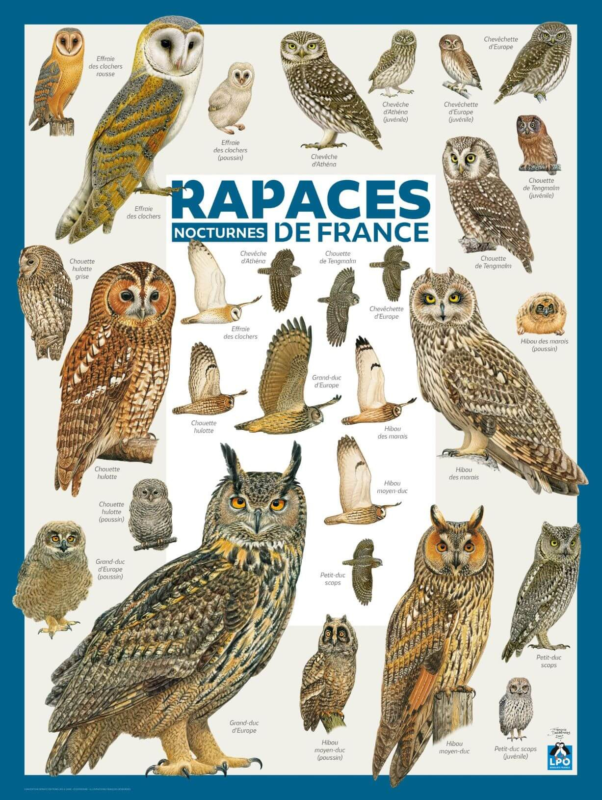 Ce poster 60x80 cm est à la fois une planche naturaliste exhaustive des rapaces nocturnes et un formidable outil pédagogique.