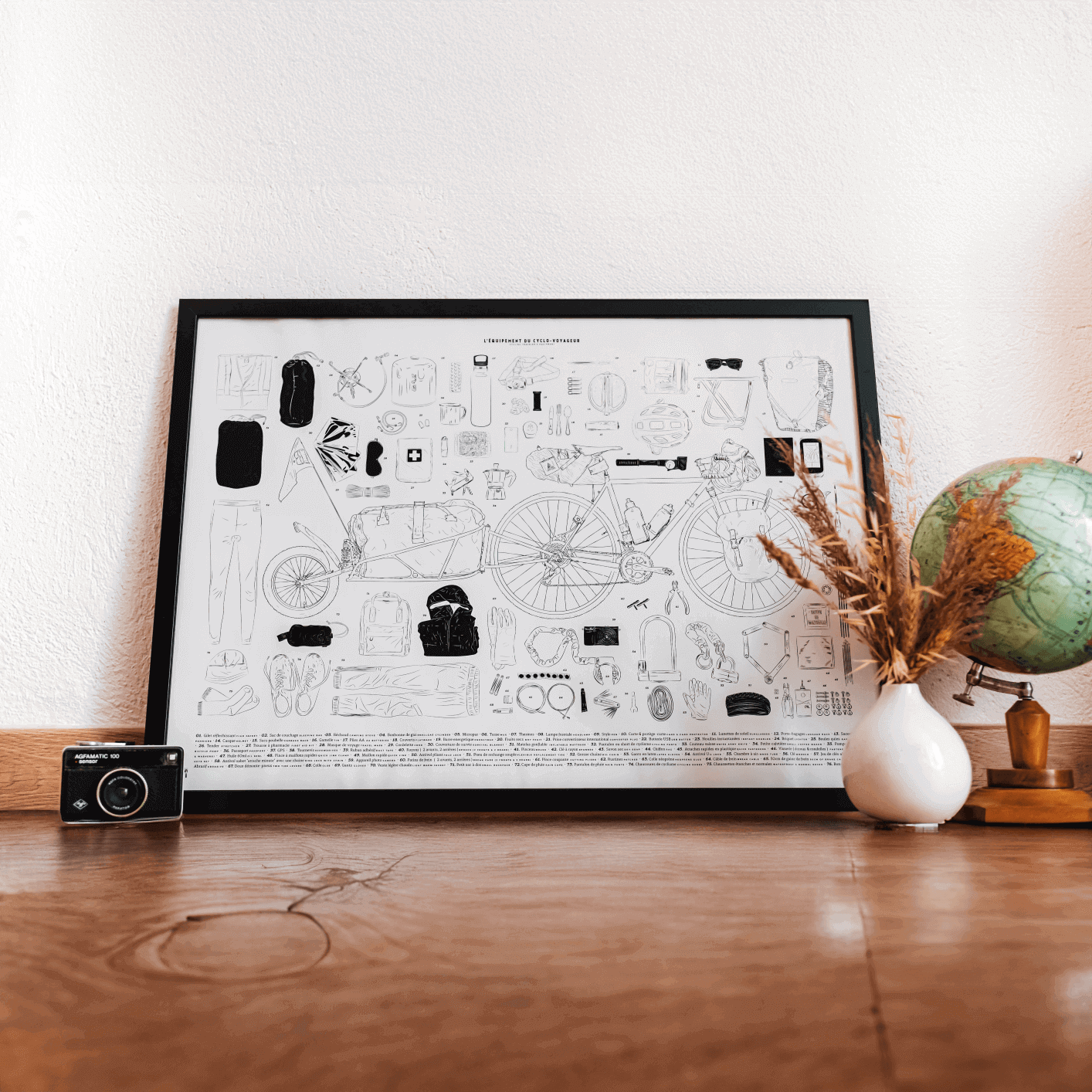 Découvrez l'affiche du cycliste, une illustration en noir et blanc réunissant tout l'équipement essentiel pour les cyclo-voyageurs.