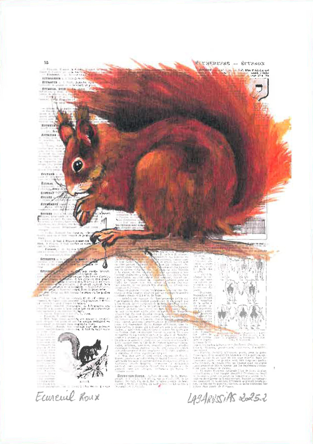 (Ref. PA0768)Carte postale d'art Ecureuil roux, magnifique reproduction d'un original peint à la main sur une feuille d’encyclopédie.